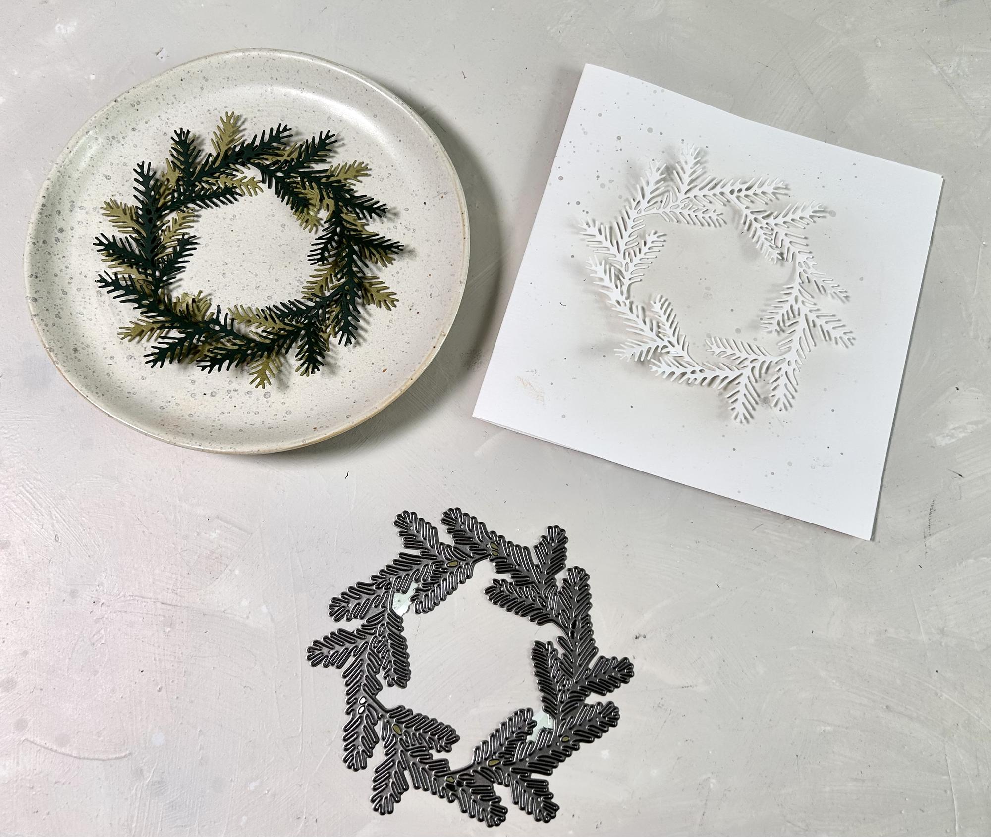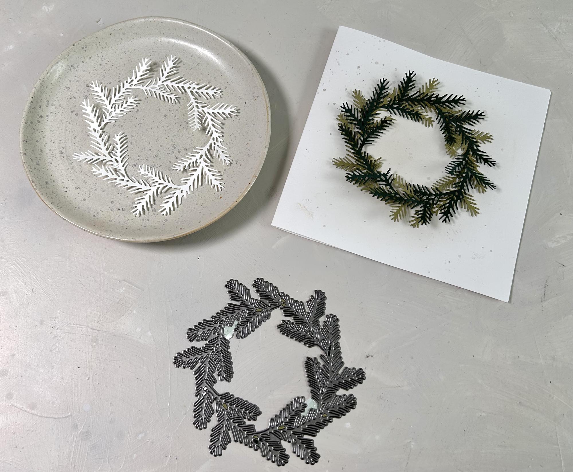 Eine filigrane und zarte Tannekranz Stanzschablone. Aufgrund ihrer feinen Verästelungen empfehlen wir diese auf einer intakten Schneideplatte mit der Schneideseite nach oben einzulegen.