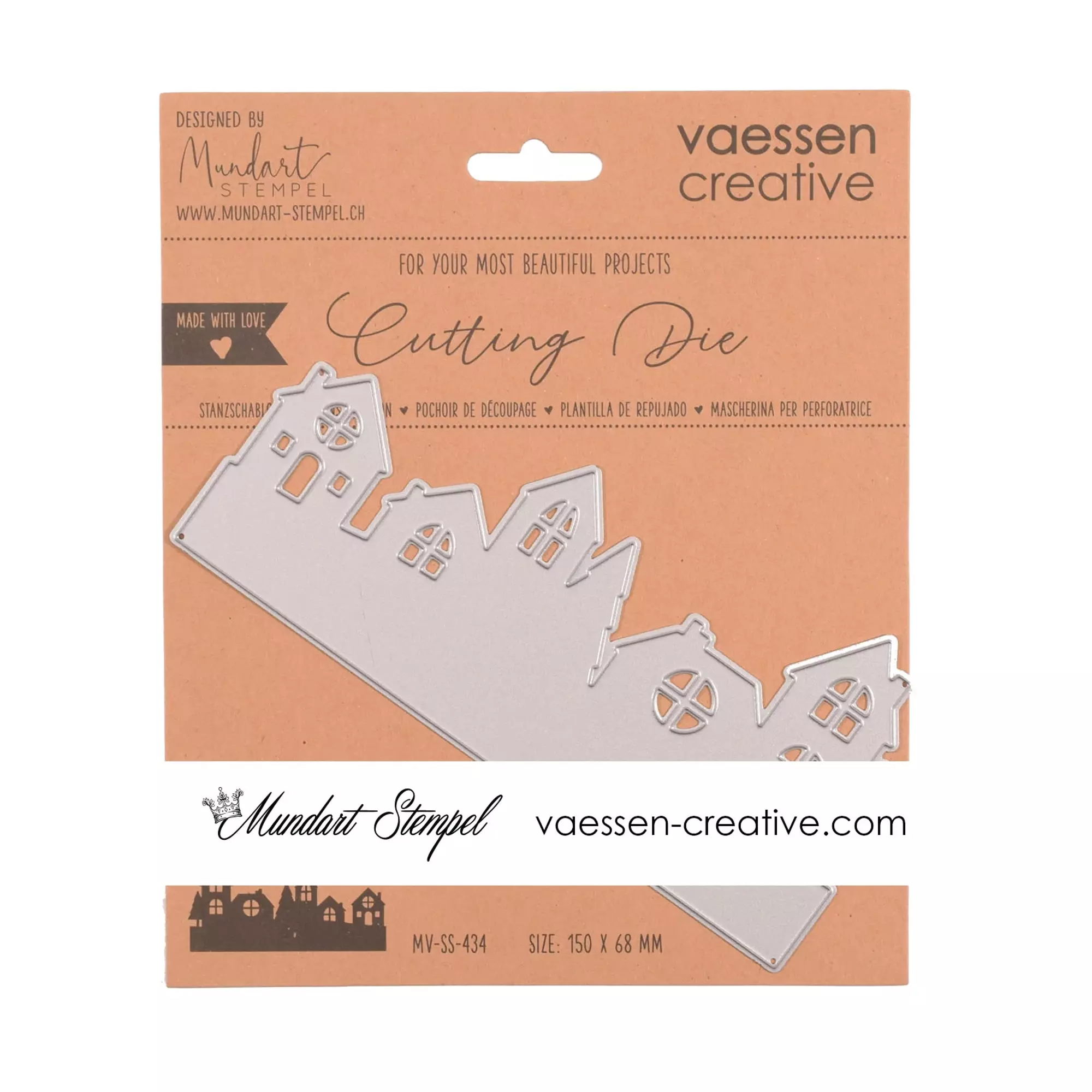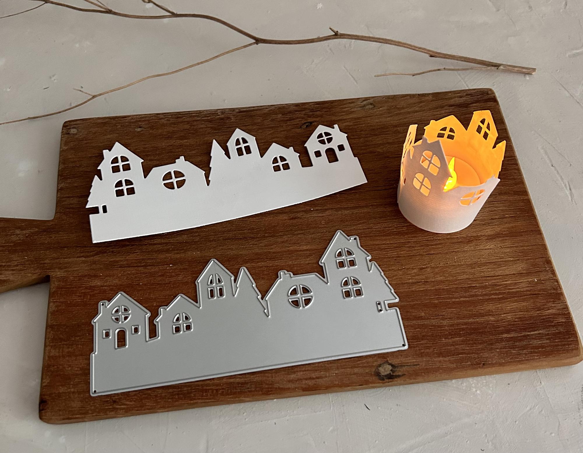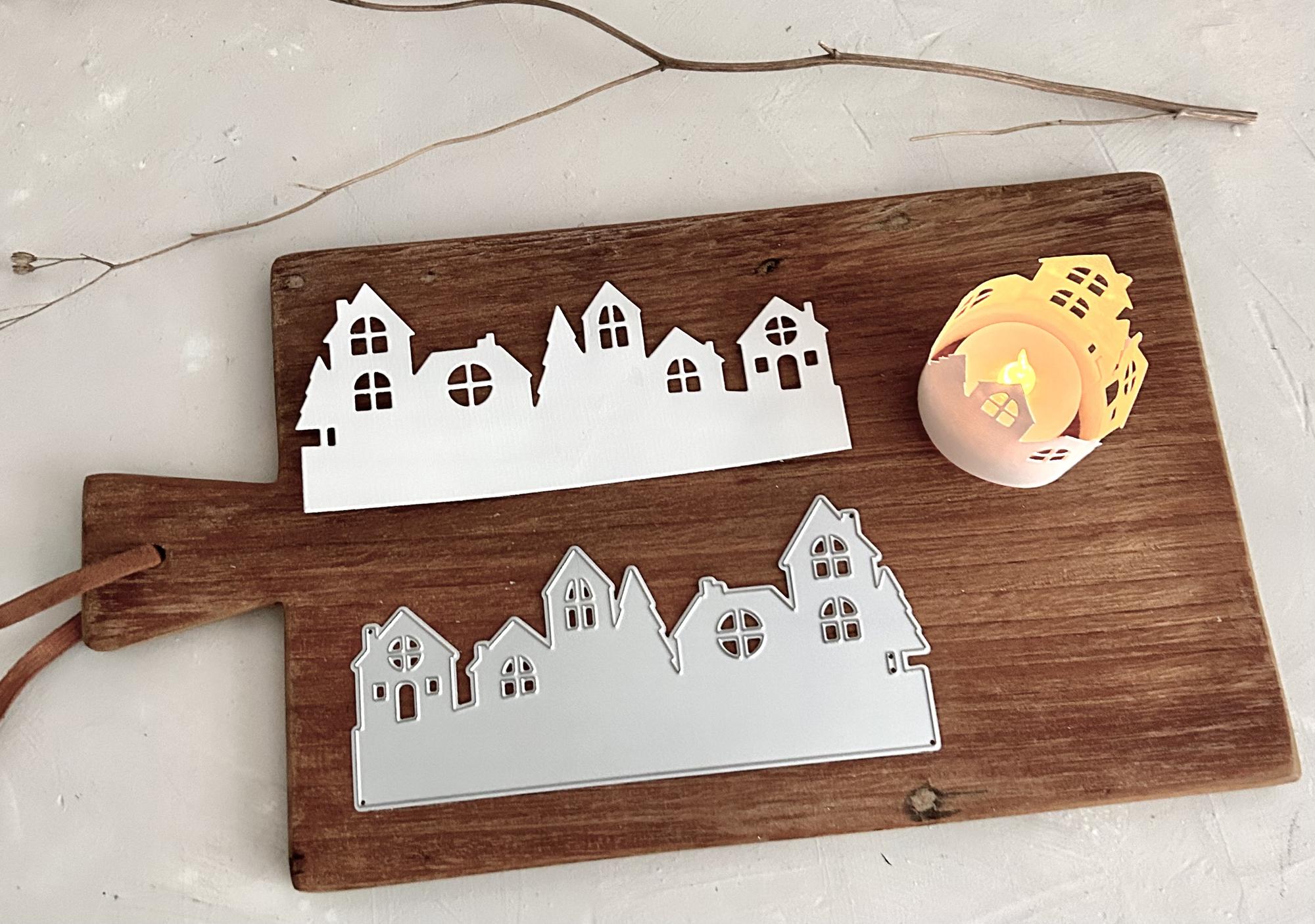 Eine große Häuser Silhouetten Stanzschablone. Toll als Highlight einer Karte oder zusammengeklebt als Teelichthalter (LED). Die Größe liegt bei 6,8x15 cm.