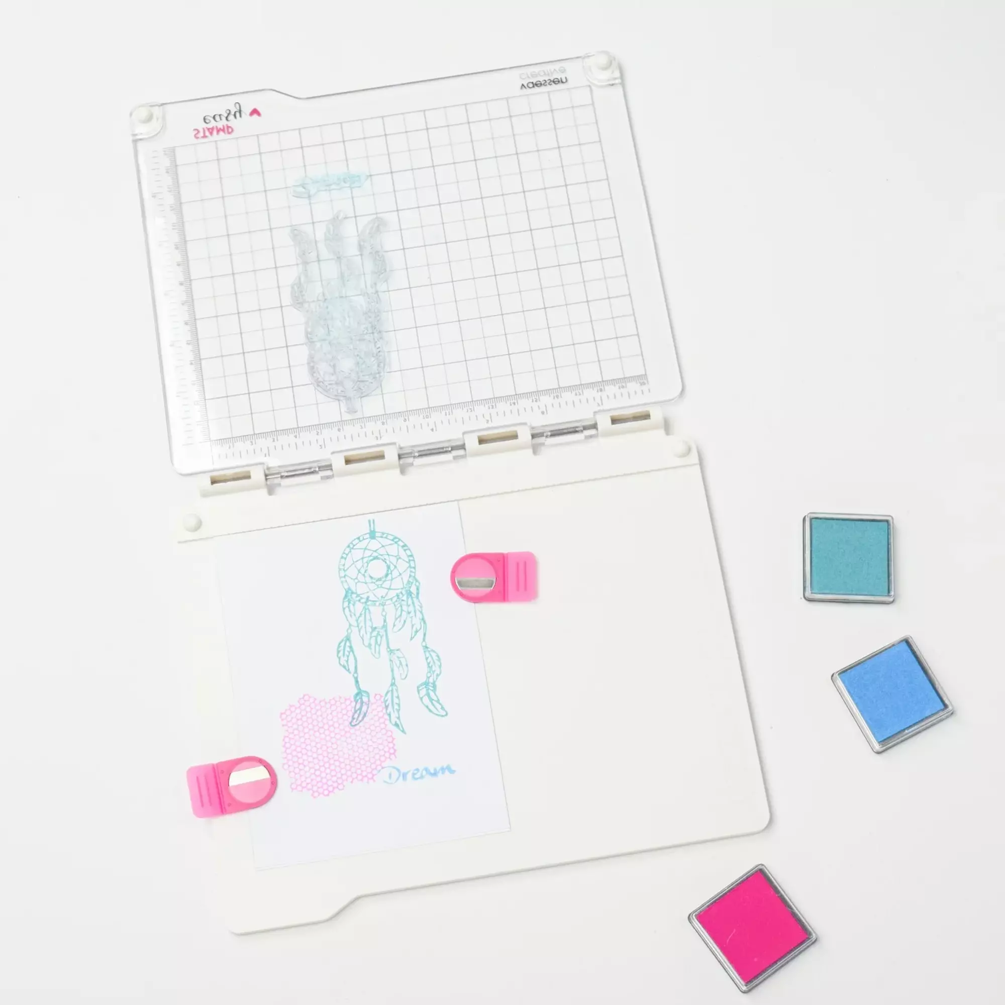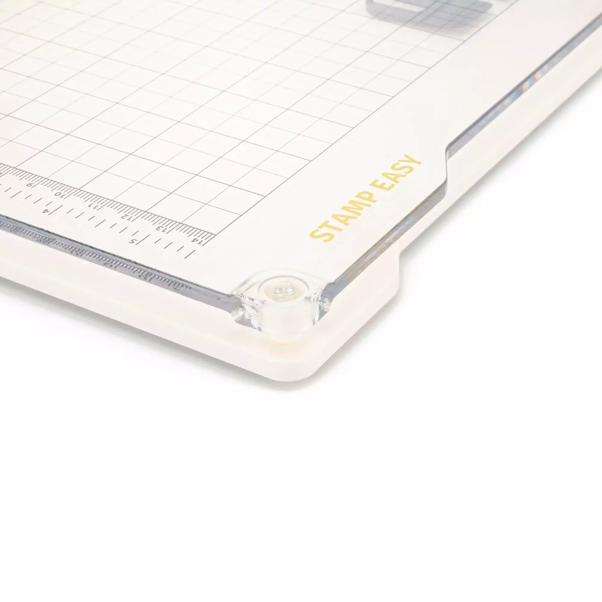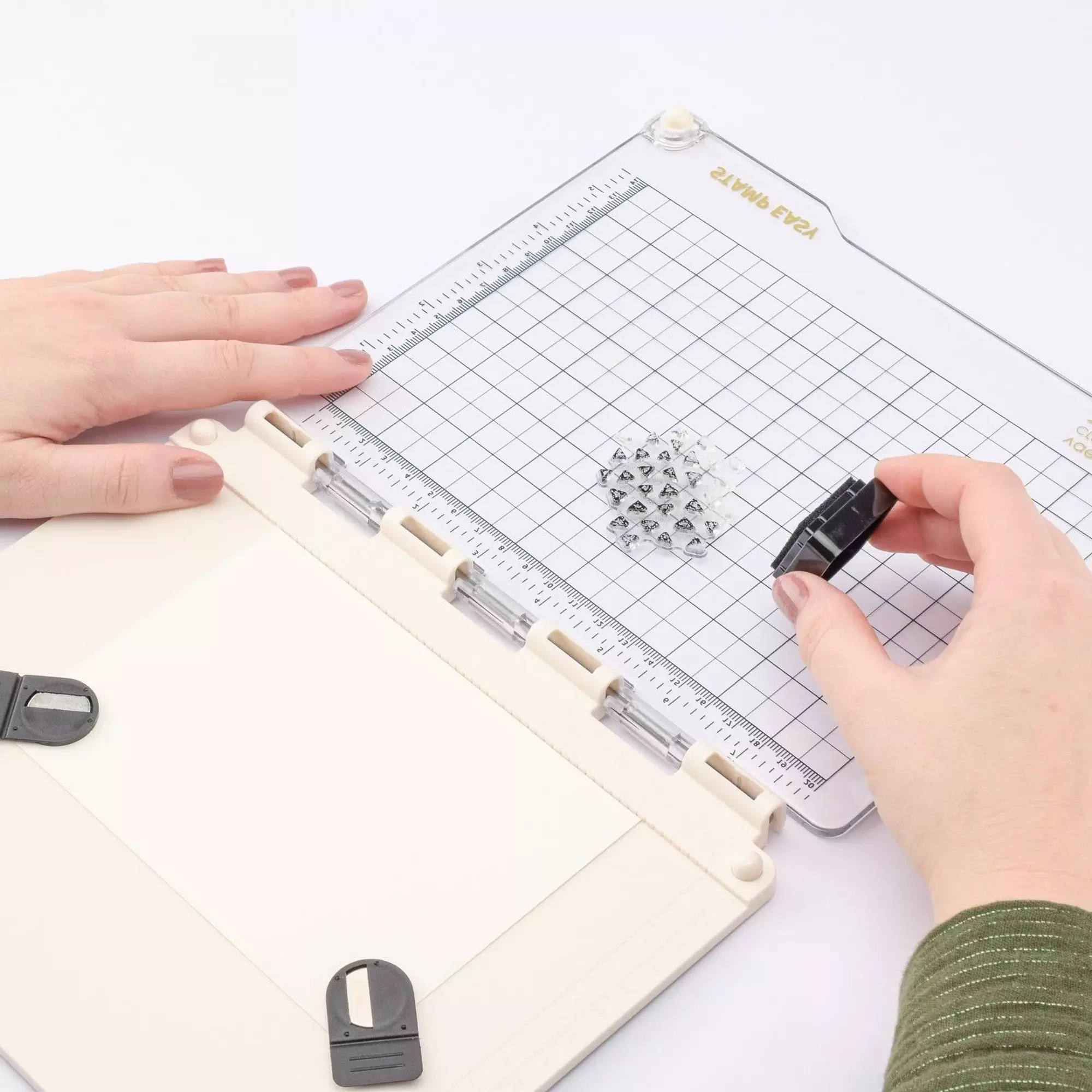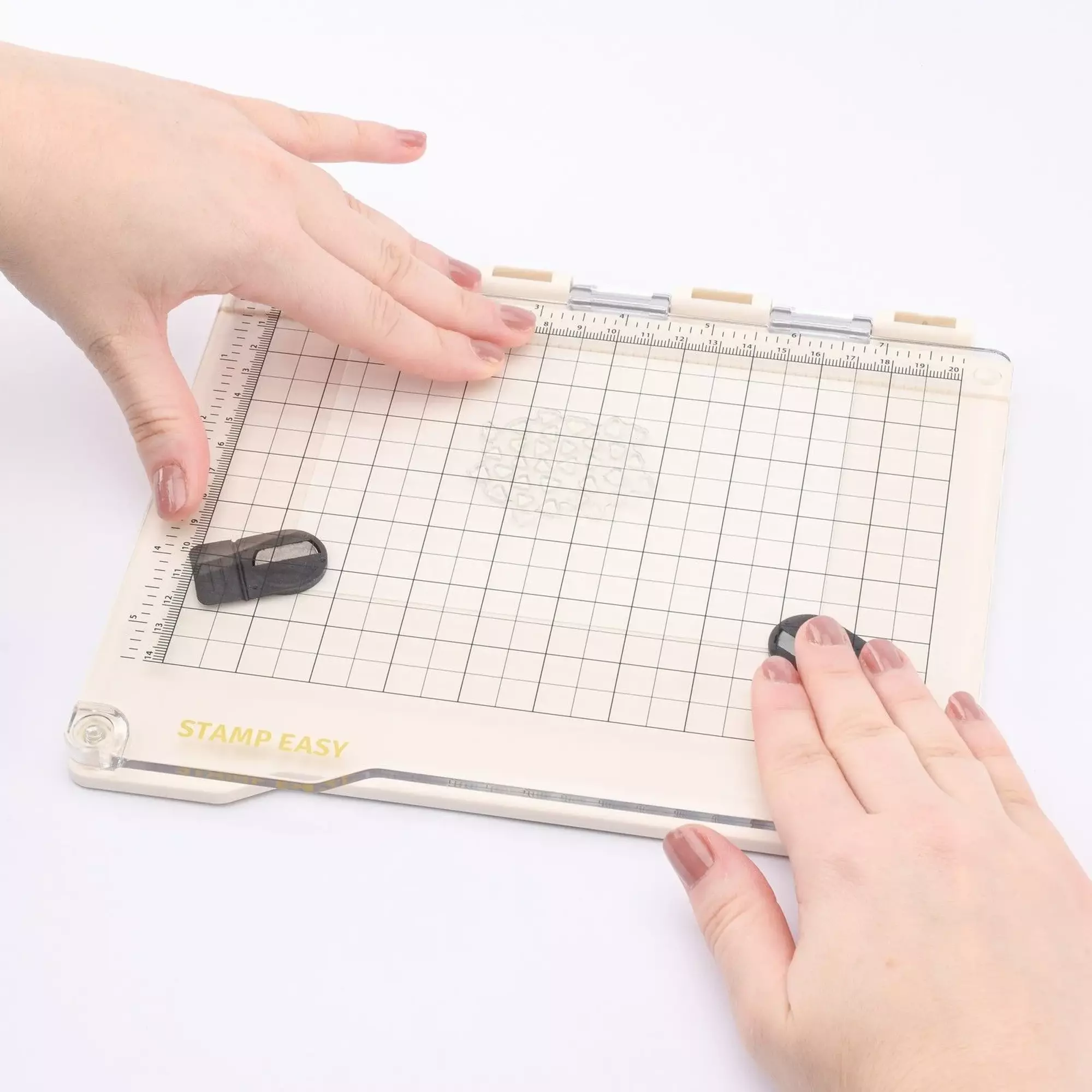 Sowohl auf der transparenten Stempelplatte als auch auf dem Magnetfuß ist die Papierausrichtung in cm und Zoll angegeben. Das Stempelwerkzeug Stamp Easy eignet sich sehr gut für Bastelarbeiten mit Papier, wie z. B. die Herstellung von Karten und die Verzierung eines Bullet Journals oder Scrapbooks.