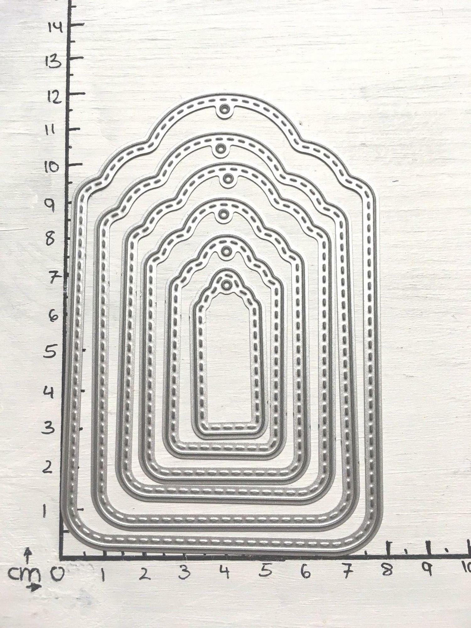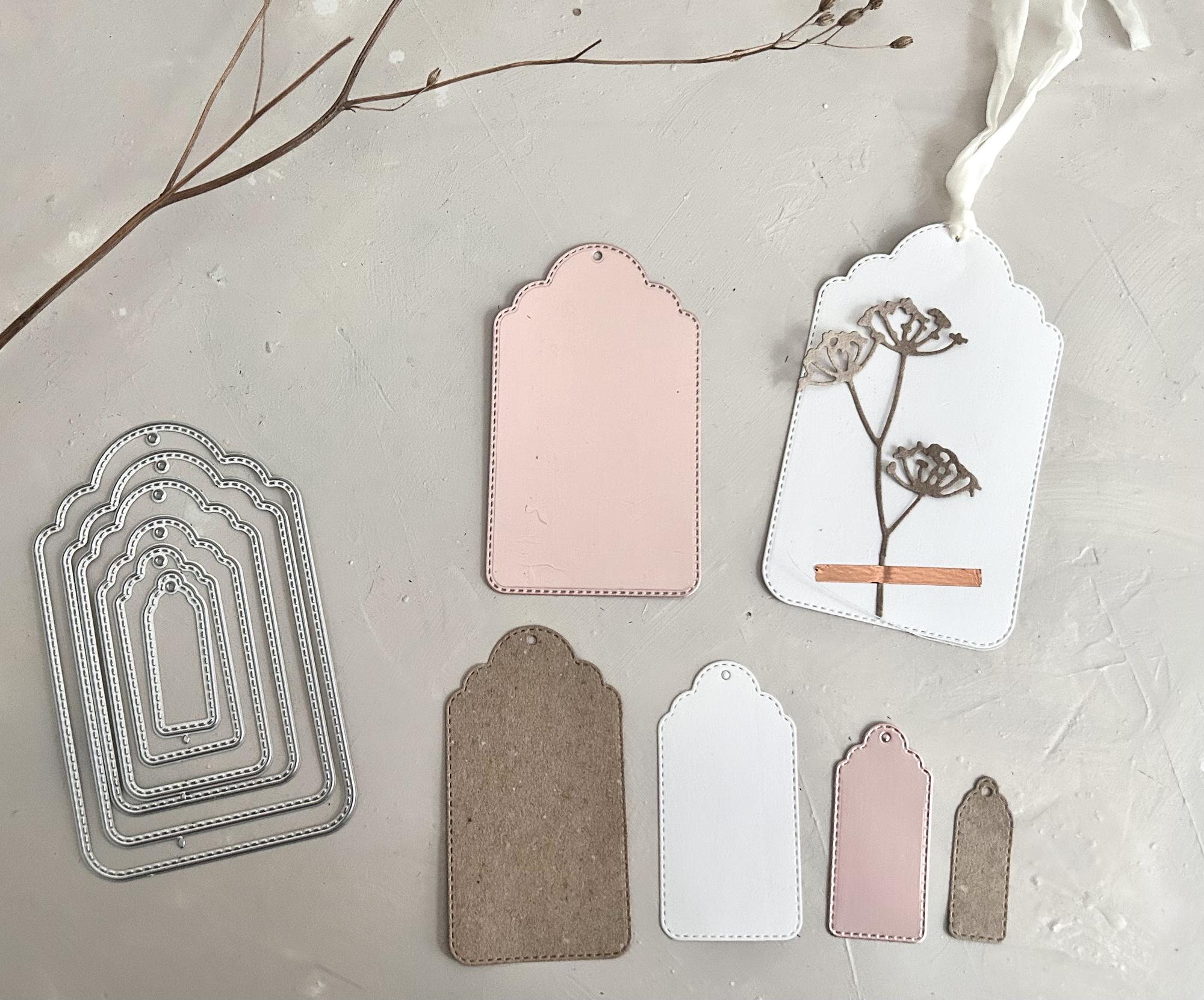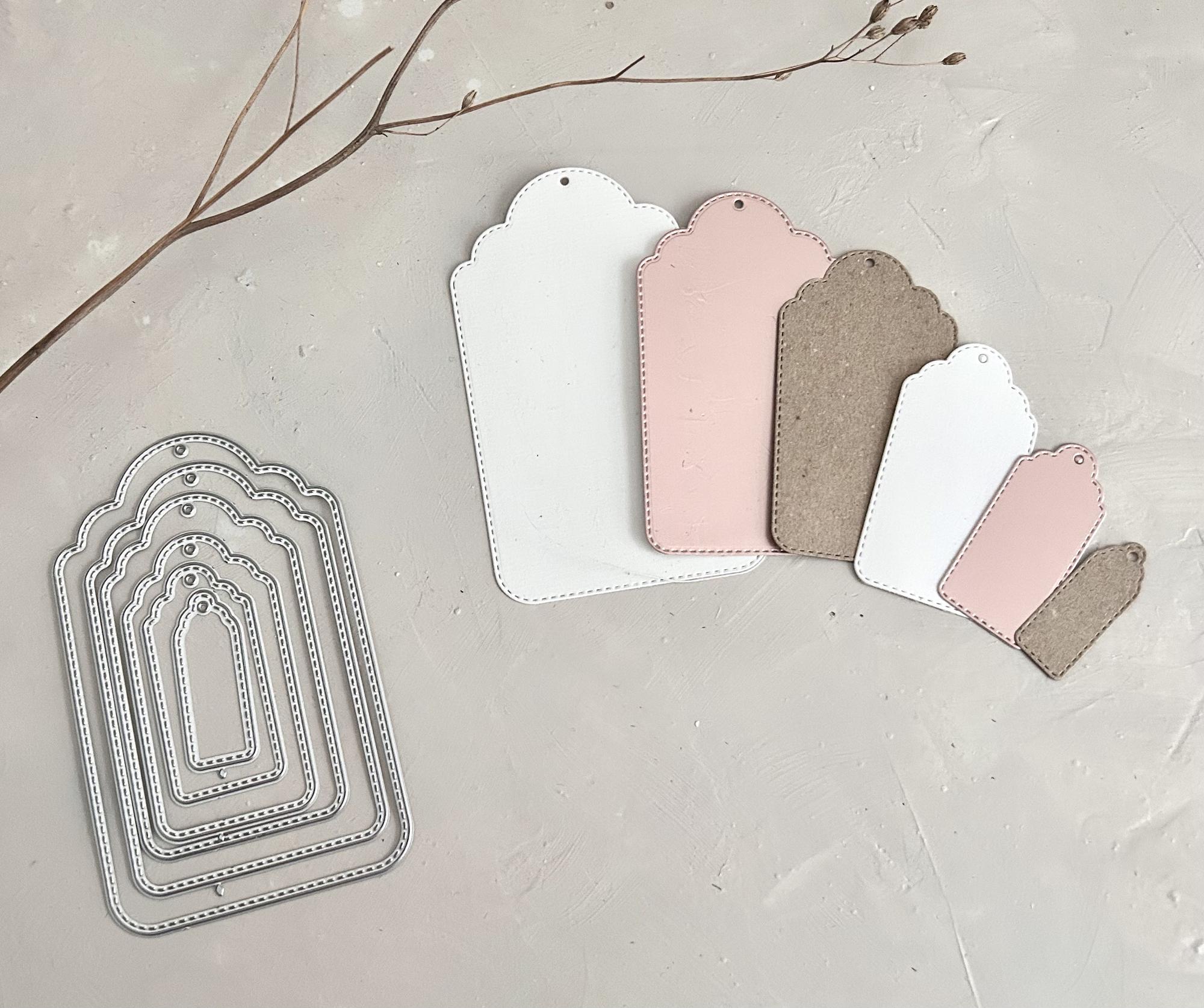 Das"Shabby chic" Stanzen Set stanzt Ihnen Anhänger mit leichtem Scallop Rand aus. Die Label haben einen gestitchten Rand.