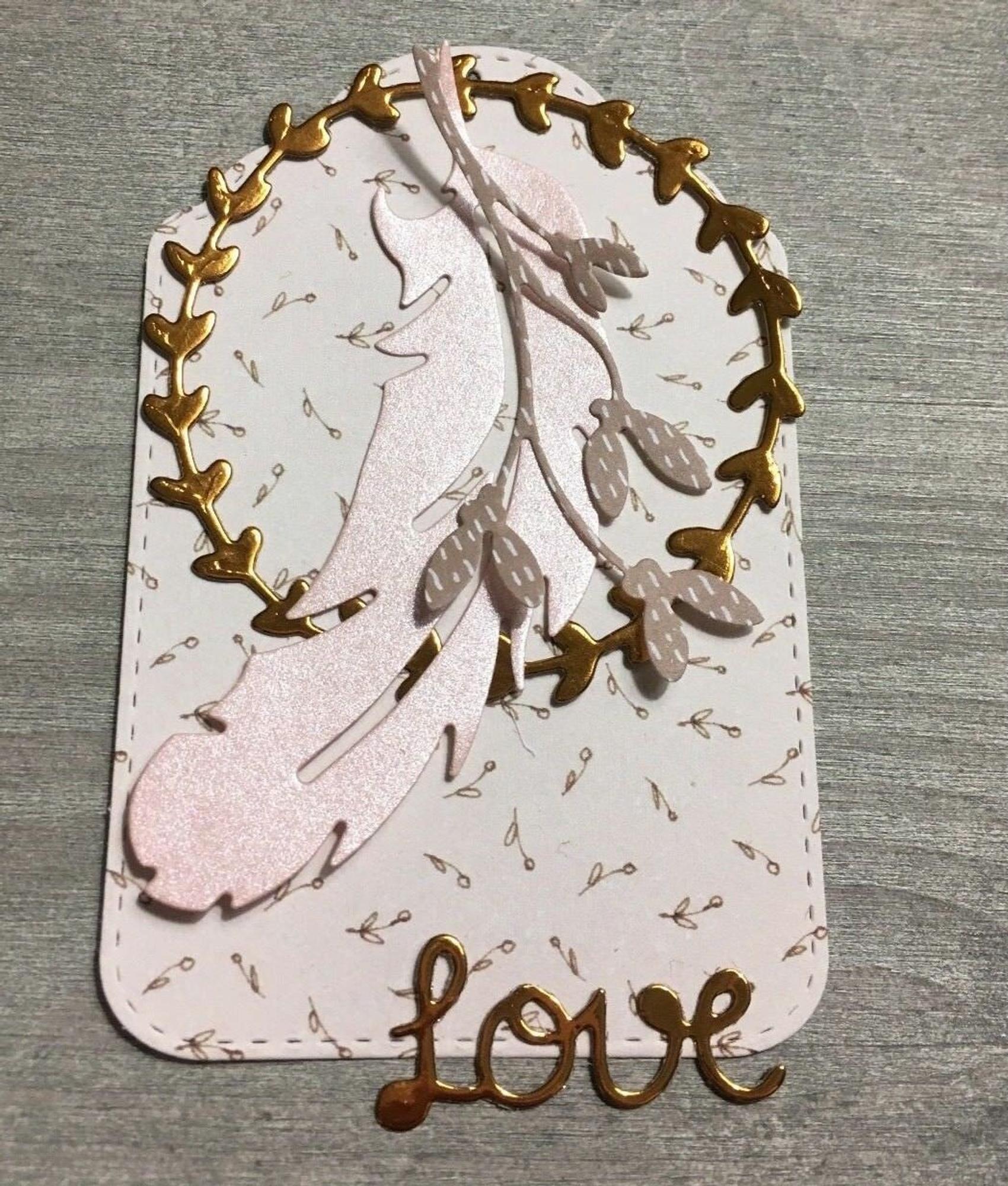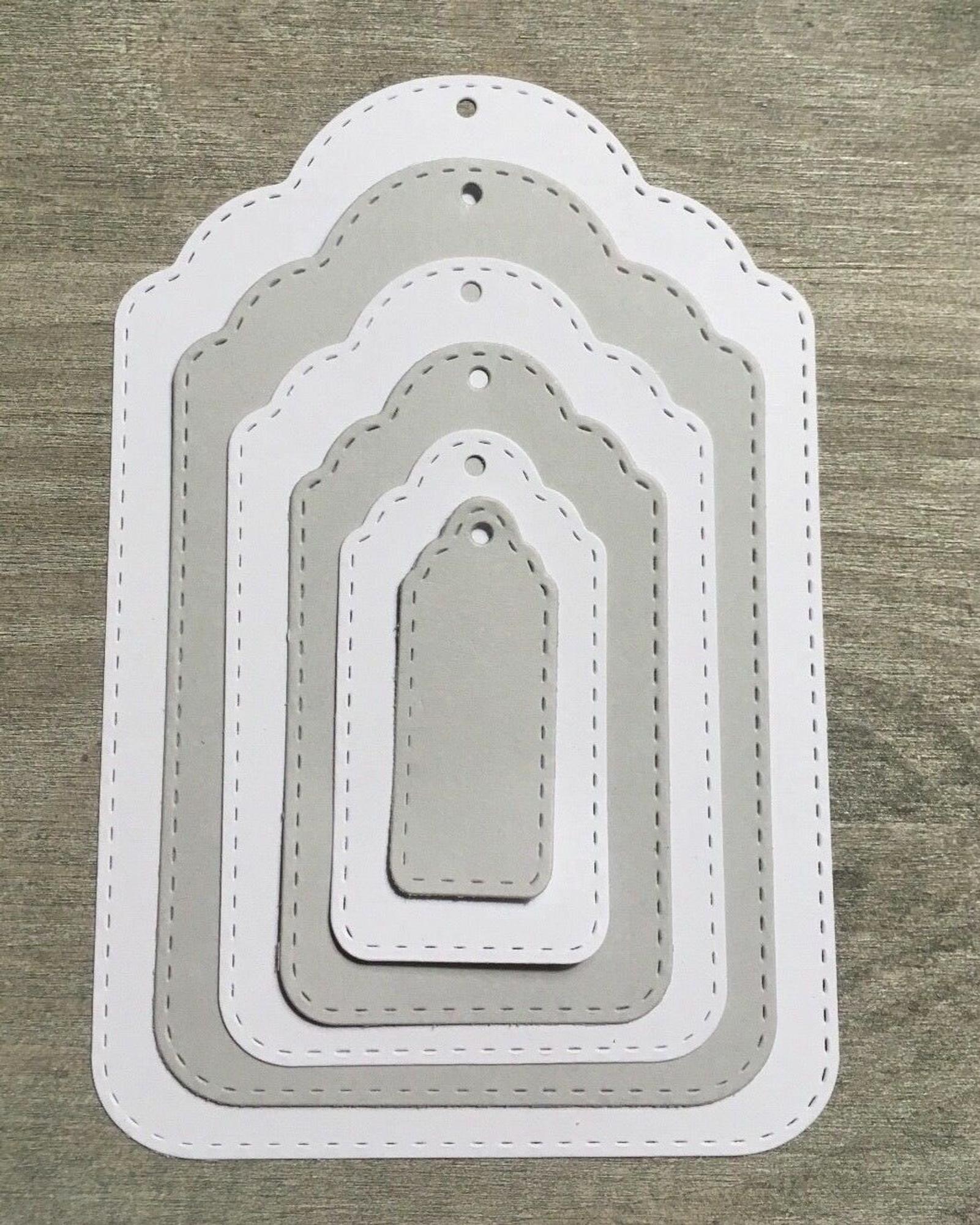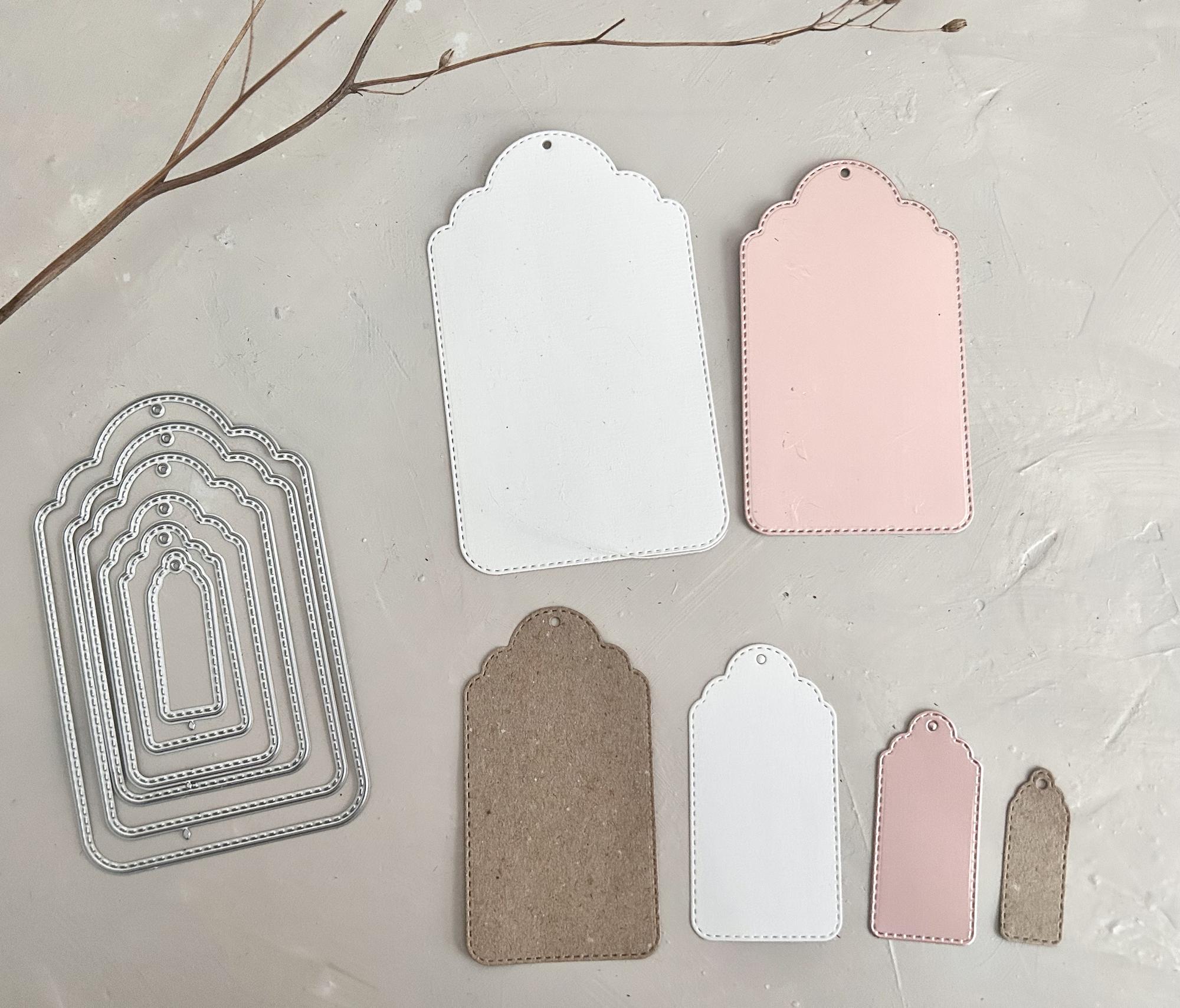 Das"Shabby chic" Stanzen Set stanzt Ihnen Anhänger mit leichtem Scallop Rand aus. Die Label haben einen gestitchten Rand.