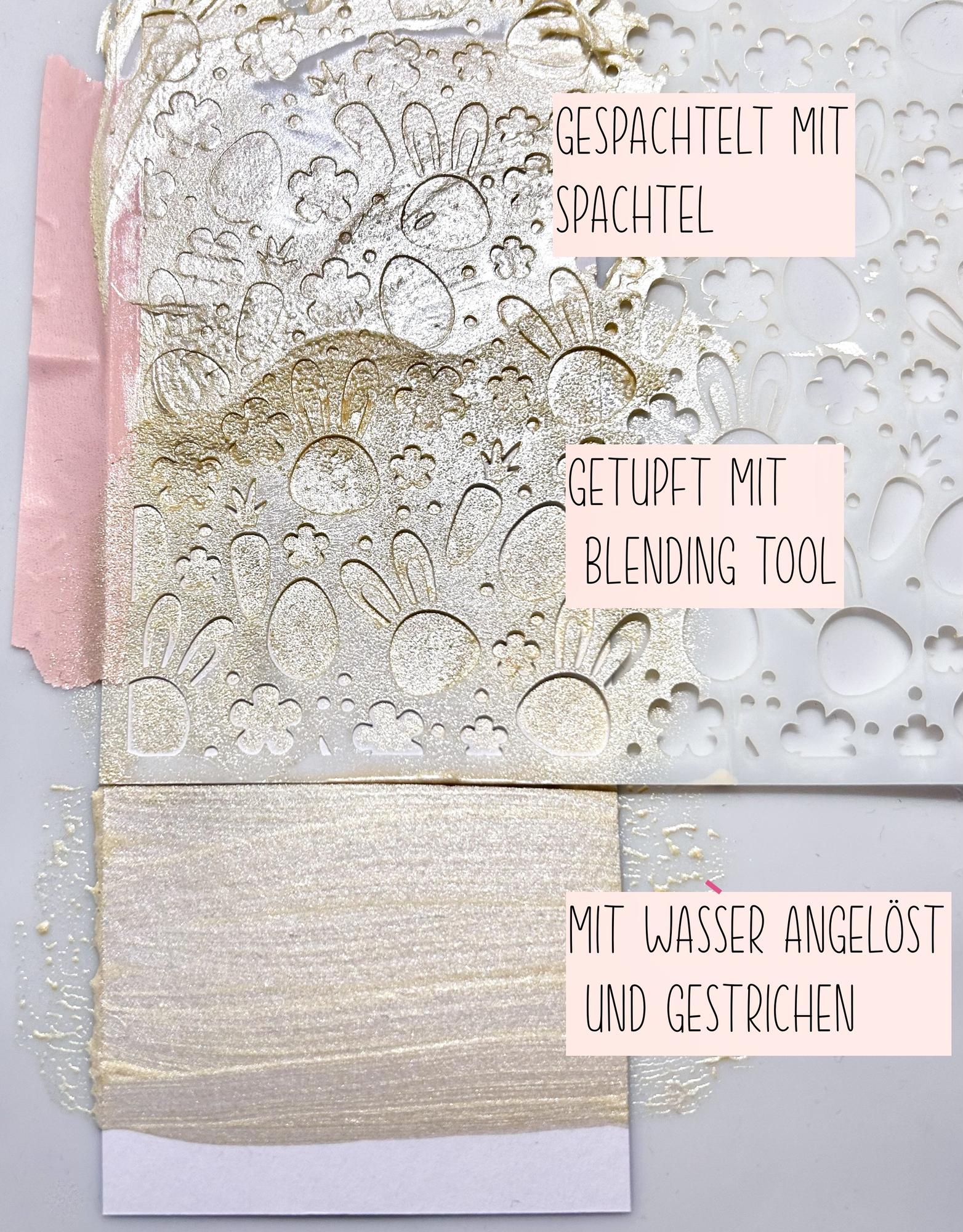 1. Auftrag pur mit Spaten oder Malmesser. Die Creme wird mit einem Spatel dick über die Maskierschbalone gestrichen. Nach dem Abziehen der Schablone befindet sich ein satter Farbauftrag auf dem Papier