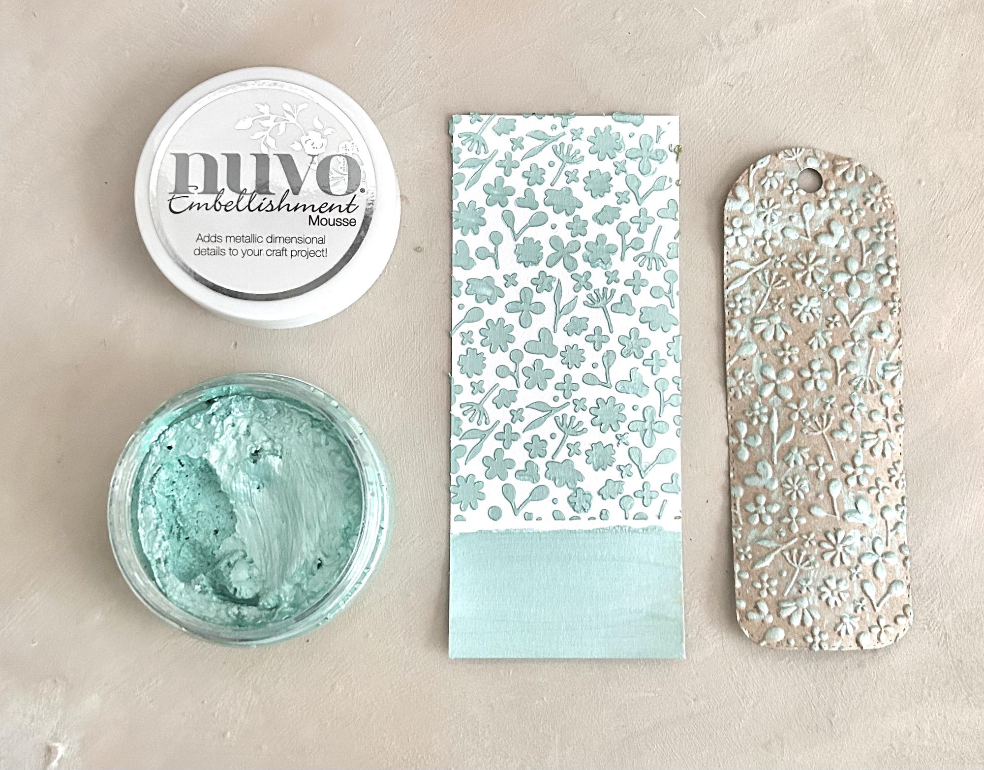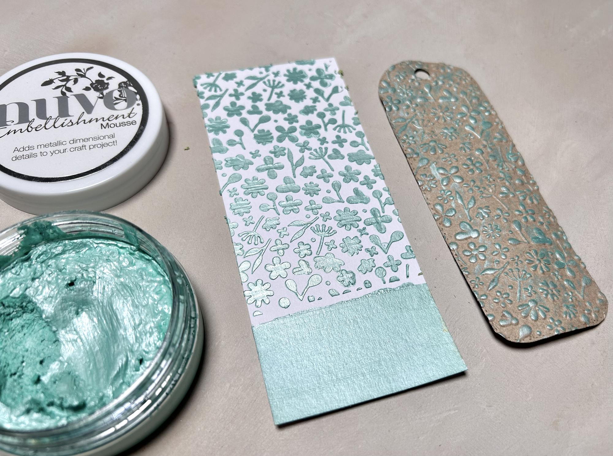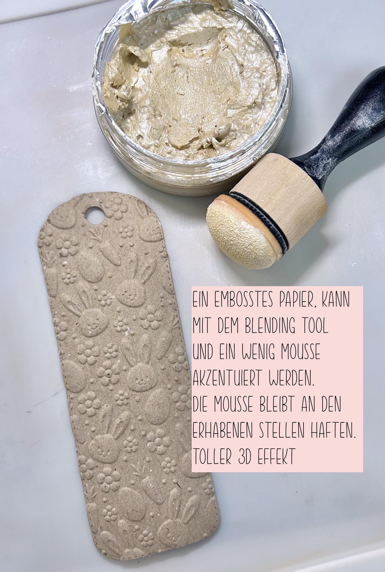 4. Mit einem Schwamm oder dem Finger kann die Creme ganz leicht auf geprägtes Papier (Embossing Folder) aufgewischt werden um einen noch tieferen 3D Effekt zu erhalten.