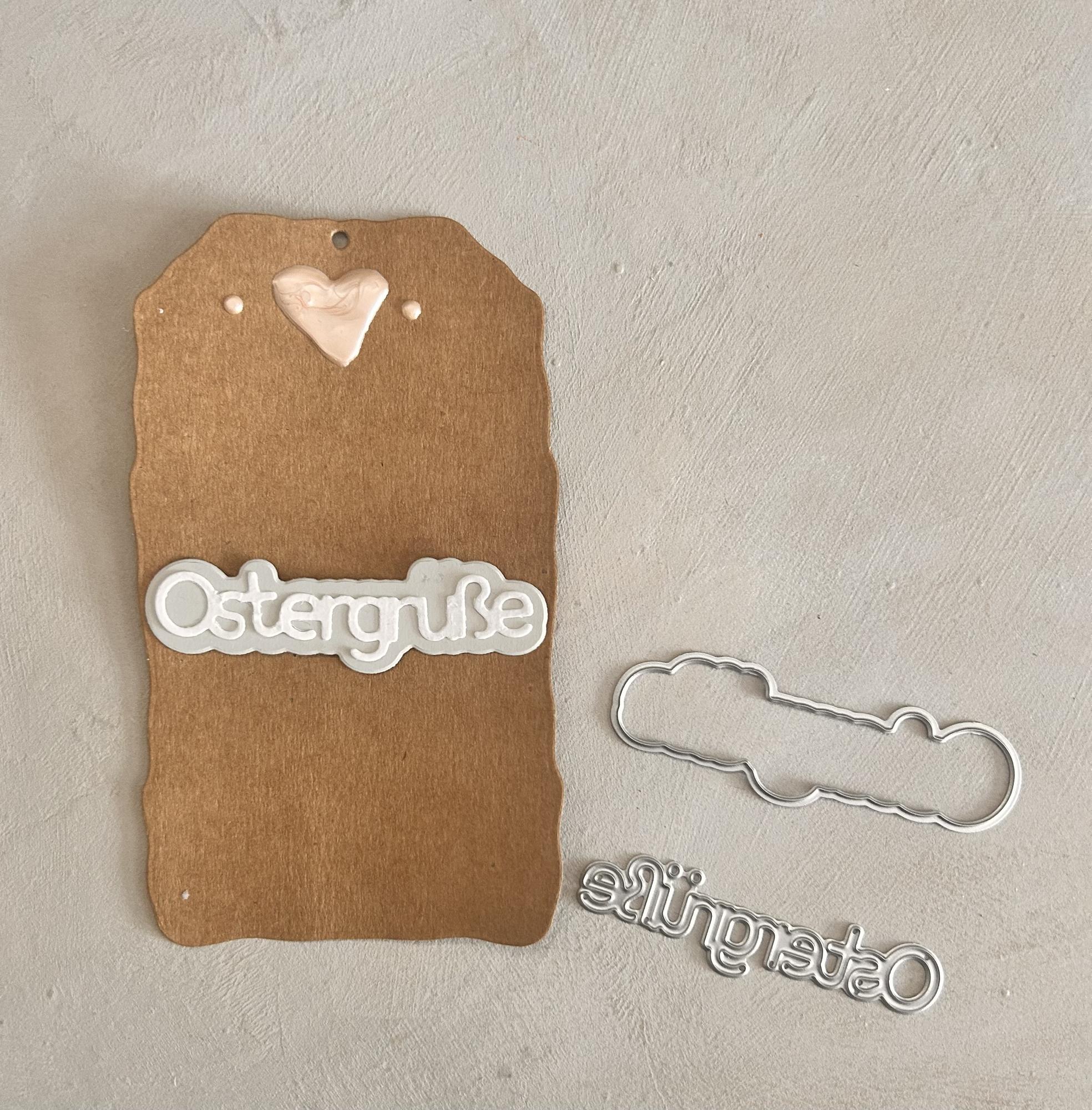 Eine tolle Stanzschablone, die einen Schriftzug mit den Worten "Ostergrüße" ausstanzt. Der Schriftzug ist 1,5x6,5cm.