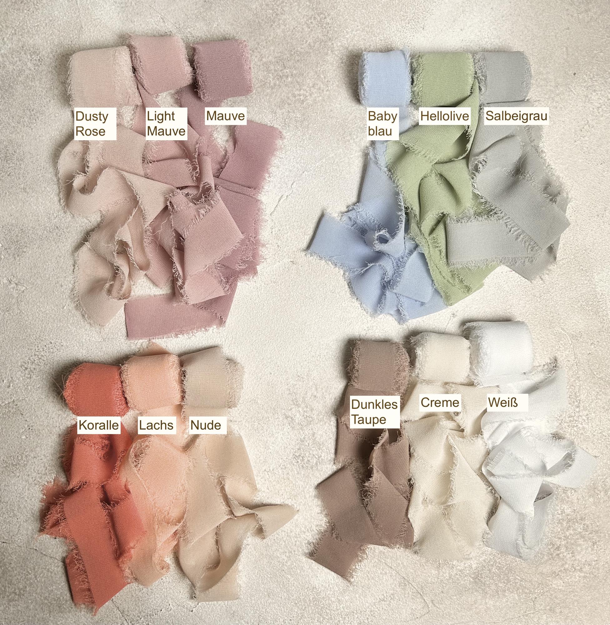 Das Band ist ein 2,5cm breites und 4,5m langes, weiches, zartes & leichtes Chiffonband. Es wurde eingefärbt und die Kanten wurden aufgerauht. Passend für Liebhaber des Vintage, Boho oder Shabby Chic Looks.
