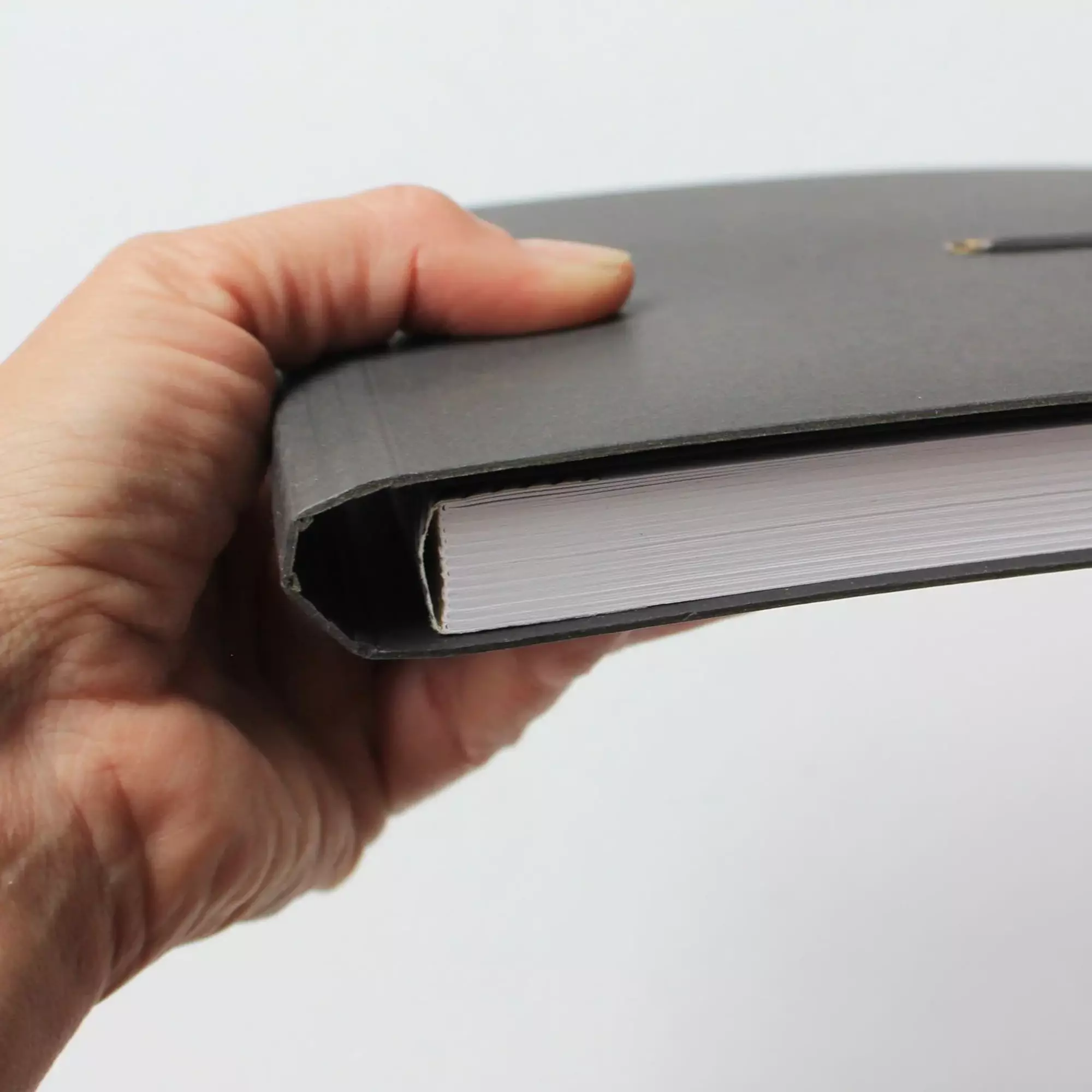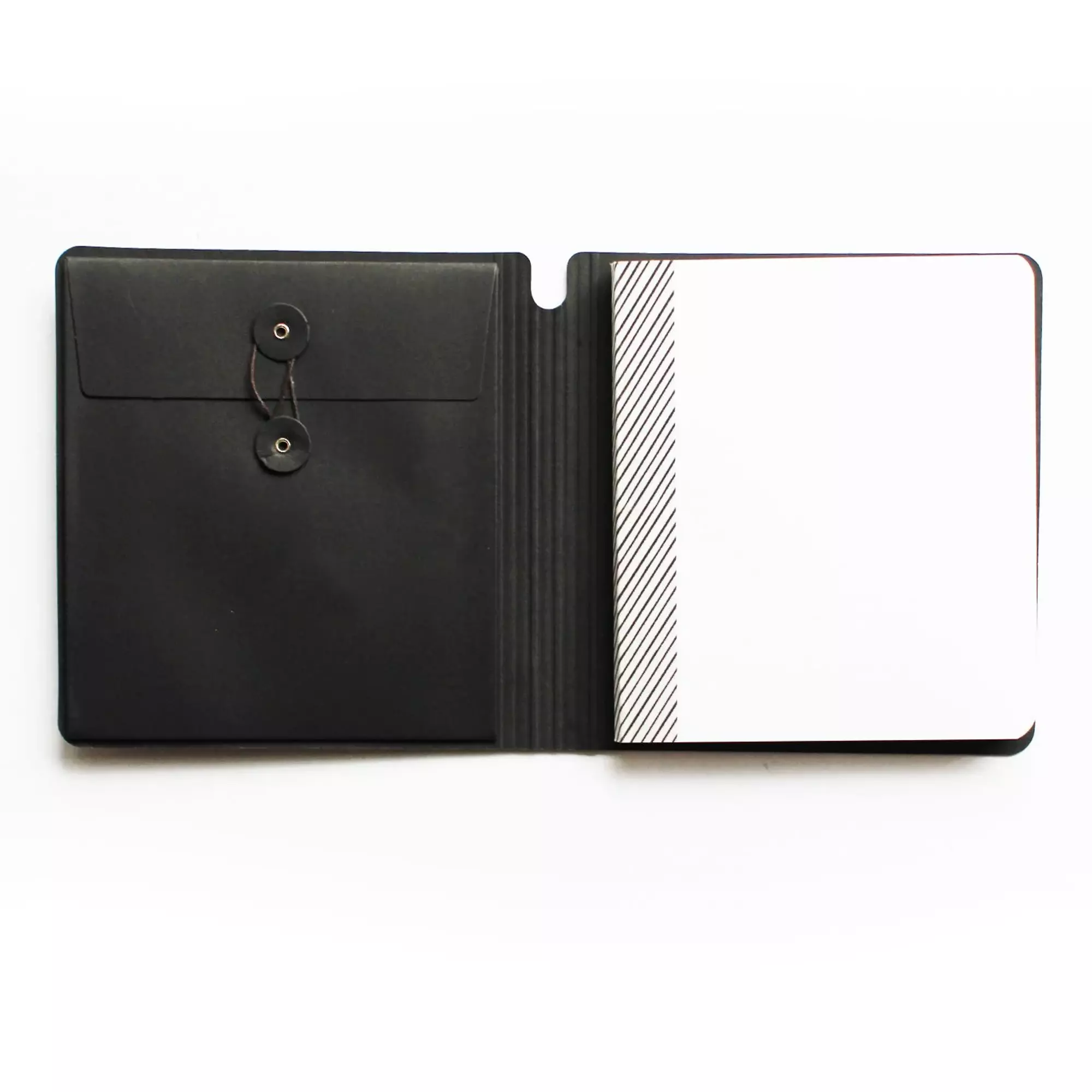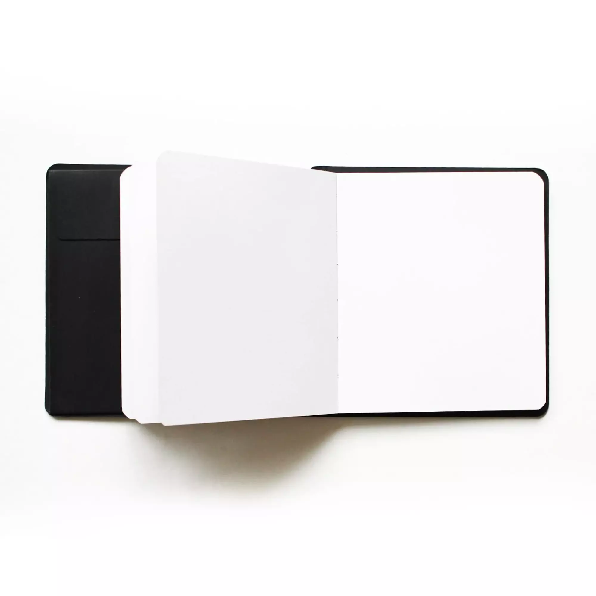 Das Hardcover-Skizzenbuch ist in einen sehr festen schwarzen Karton gebunden und hat 48 leere, weiße Seiten mit einer Papierstärke von 240 g/m². Das hochwertige Papier lässt weder Tinte noch Malereien durchscheinen oder durchbluten. Das Notizbuch hat eine flache Bindung, sodass eine Doppelseite für ununterbrochene Kreationen genutzt werden kann. Eine kleine Tasche auf der Innenseite des Deckblattes dient zur Aufbewahrung von Verzierungen, Bildern, Aufklebern und vielem mehr.