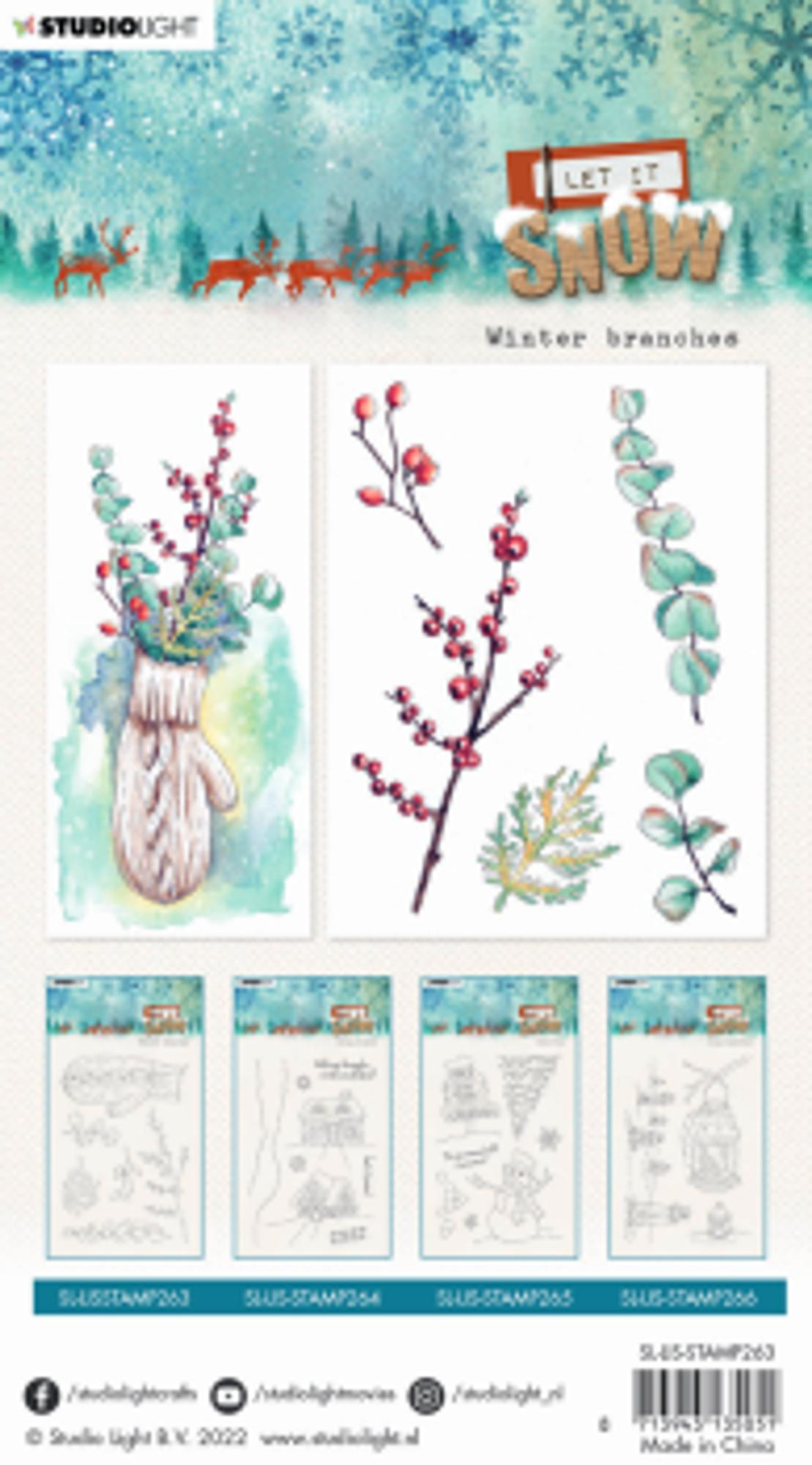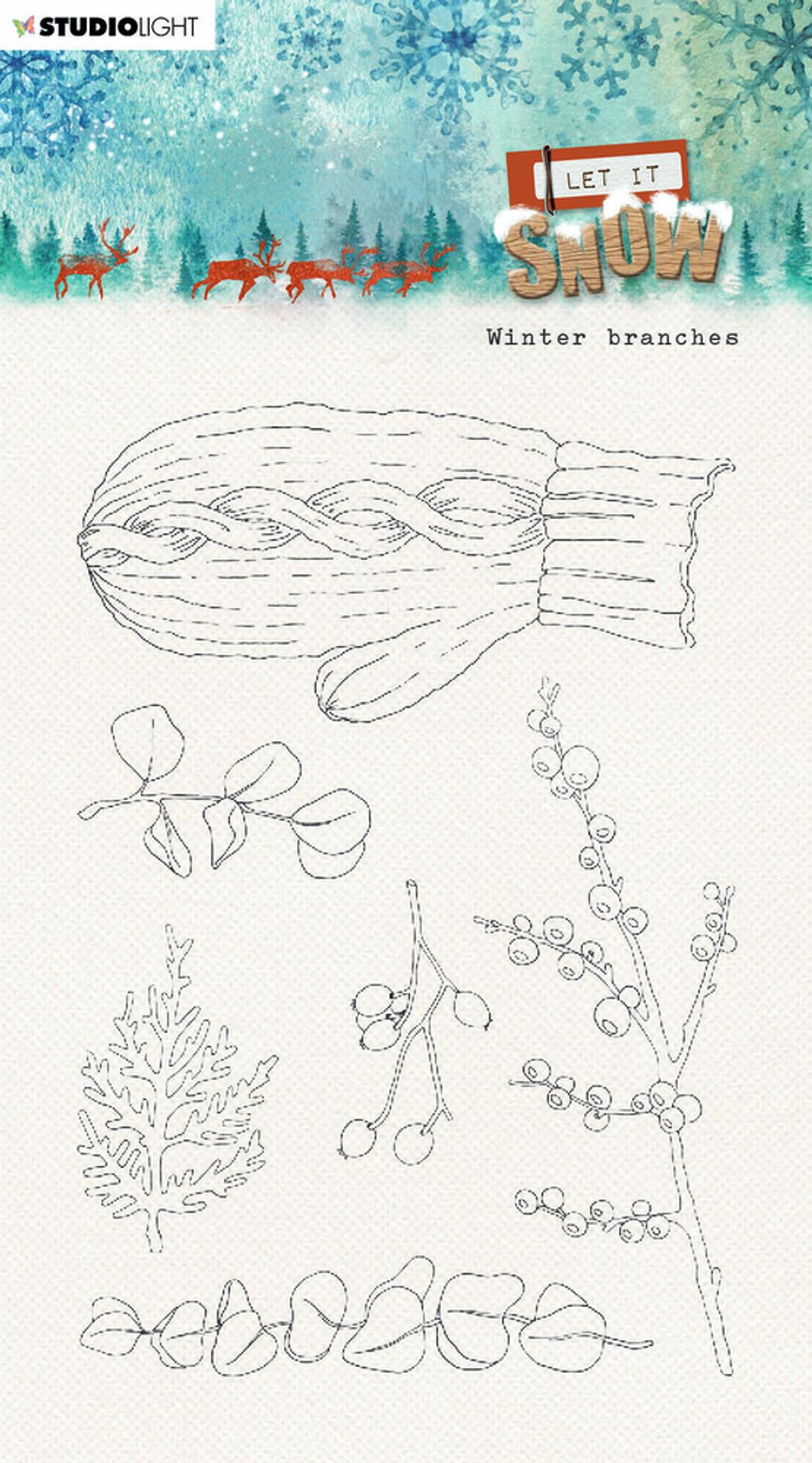 Ein sechsteiliges Stempelset aus dem Hause Studio Light mit bezaubernden Winter Zweigen und einem detaillierten Handschuh Stempel.