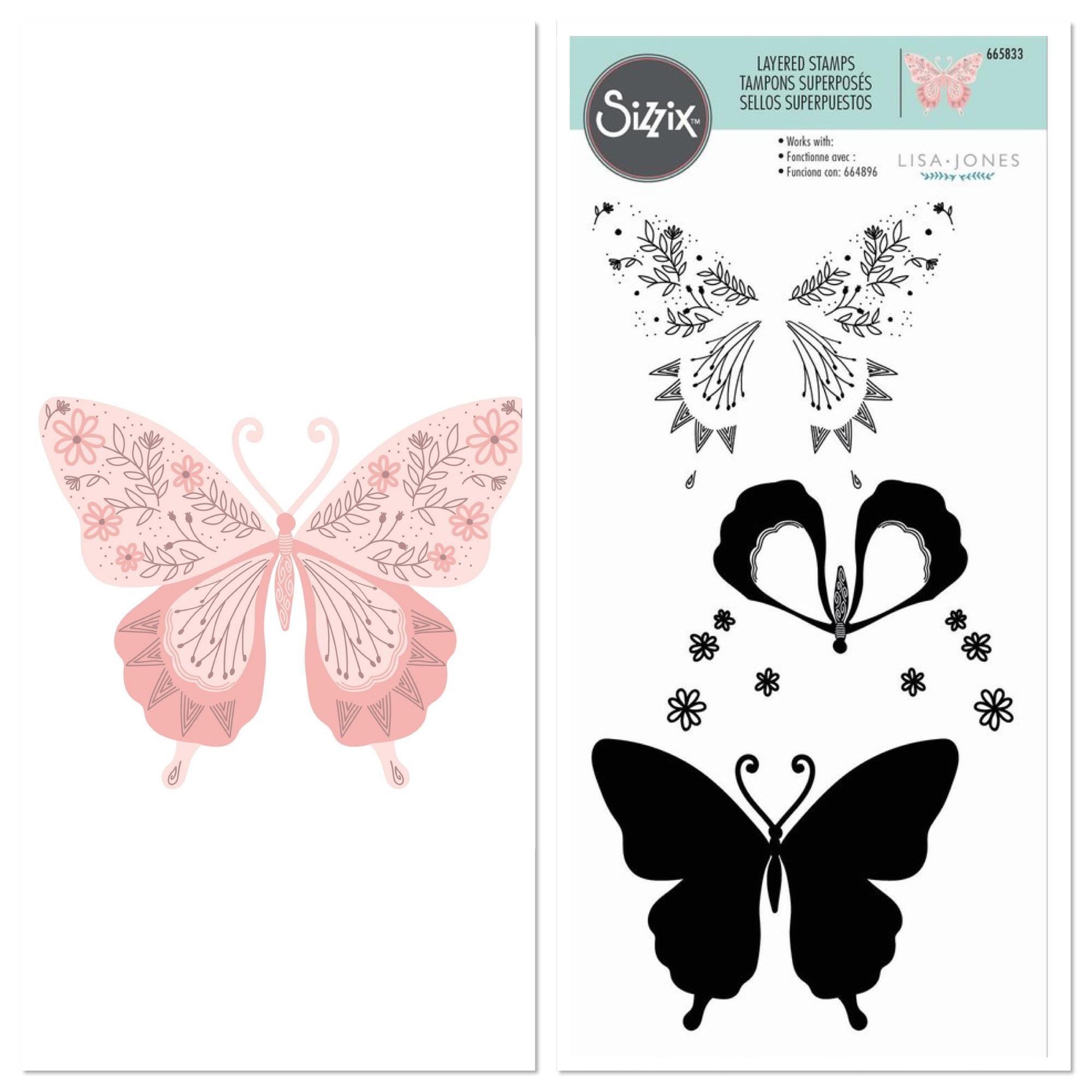 Ein bezauberndes Clear Stamp Set aus dem Hause Sizzix. Der Schmetterling wird in der Layering Technik gestempelt. d.h, dass man das Motiv aus drei verschiednen Ebenen zusammen setzt. Es gibt die BasisEbene mit der Kontur, die mittlere Ebene mit Details und die oberste dekorative Ebene mit feinsten Verzierungen.