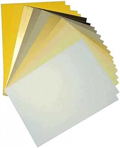 Es sind metallische, perlmuttschillernde Papiere, Fotokarton, Tonpapier, Spiegelkarton (nicht in jeder Farbe) , Mattkarton enthalten, alles in einer sehr harmonischen Farbauswahl.