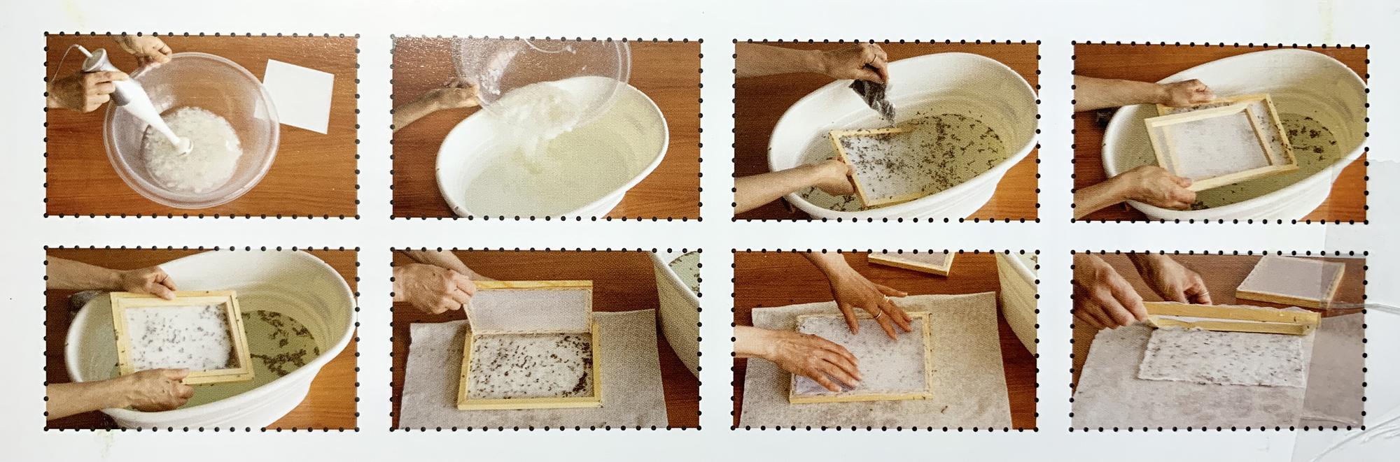 Es werden Zellstoffplatten, Papierreste, Eierkartons, Küchenpapier o.ä. in kleine Stücke gerissen und mit heißem Wasser übergossen. Nach 15 Minuten wird das aufgeweichte Papier mit Hilfe eines Mixers zu einer Papiermasse/ Pulpe zerkleinert.