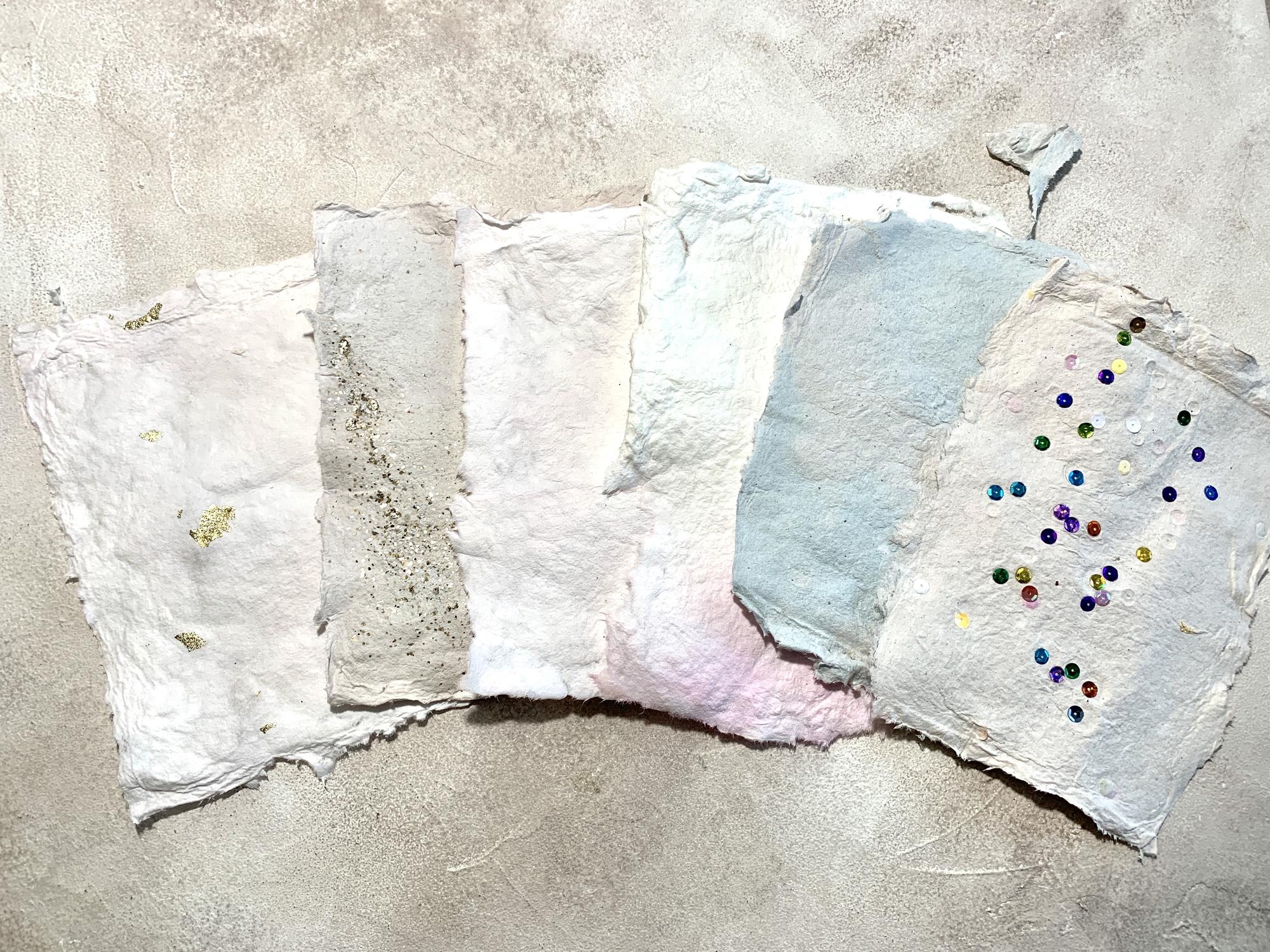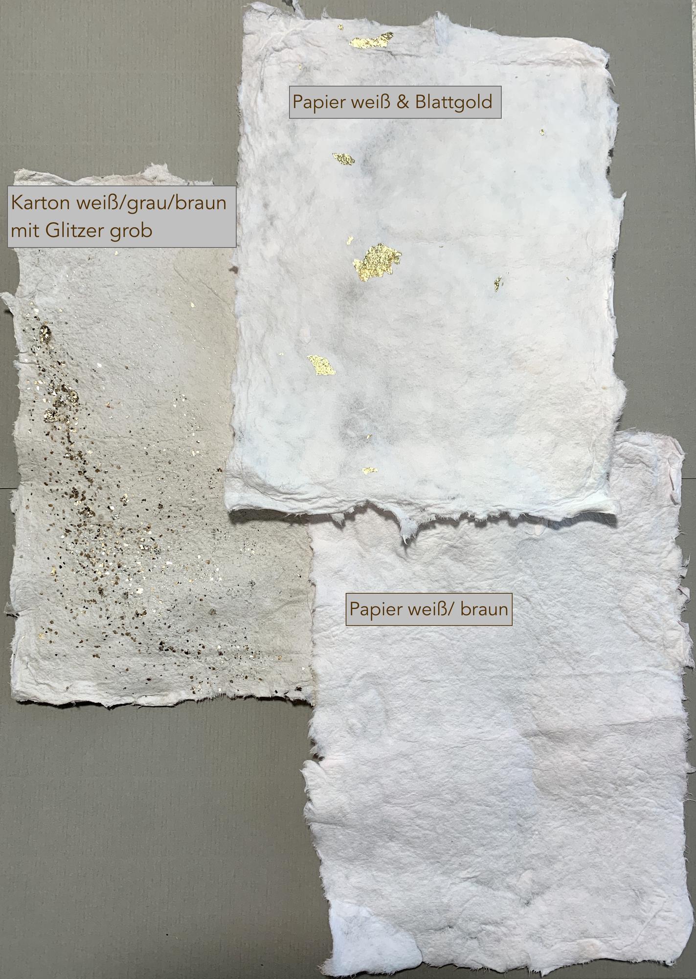 Man nimmt eine Schüssel, die größer als der Rahmen ist und befüllt sie mit Wasser. Die Papiermasse wird langsam dazu gegeben. Die Masse kann noch mit Glitzer, Farbe, Blüten, Kaffeesatz, Blattgold o.ä. ergänzt werden