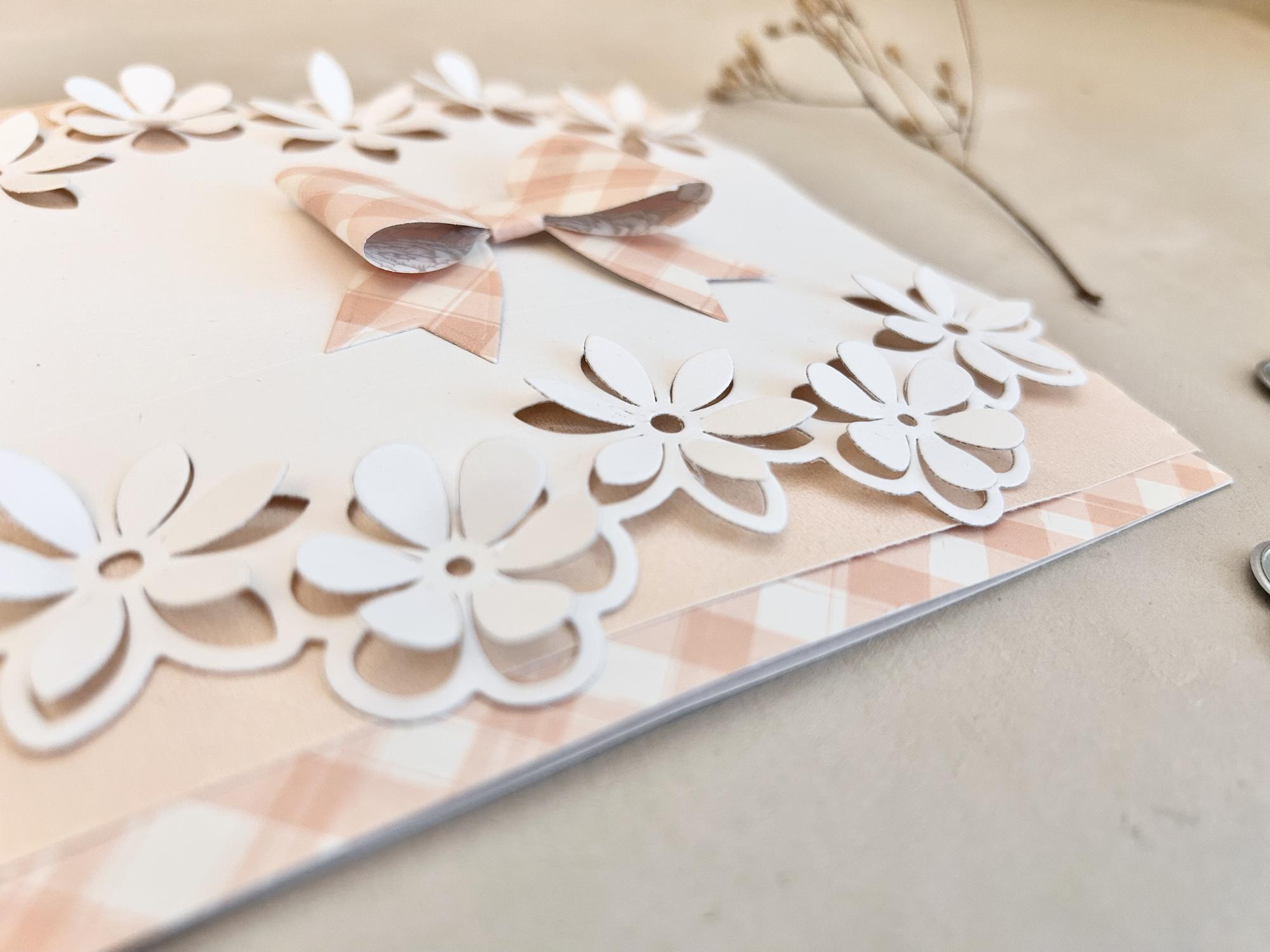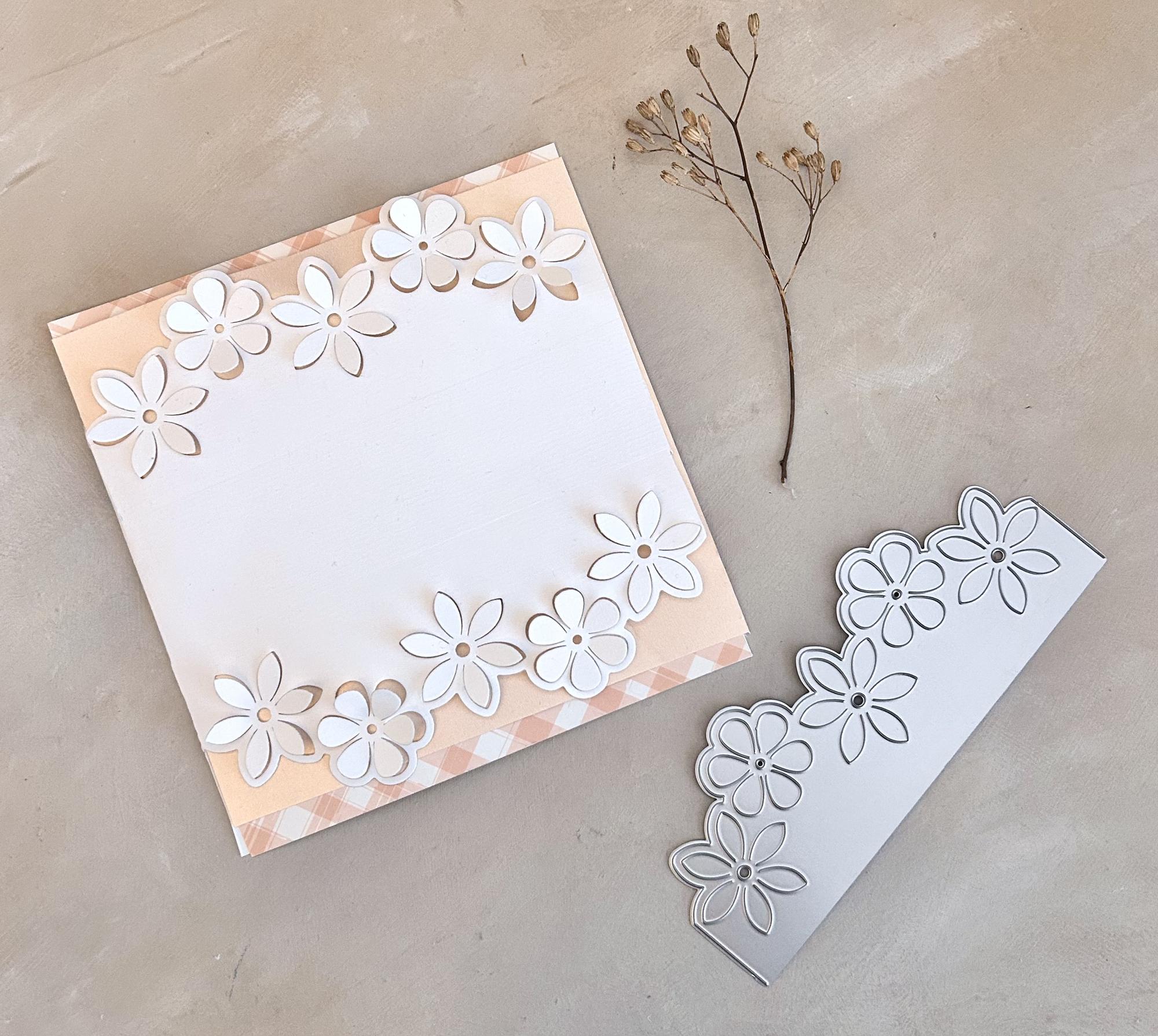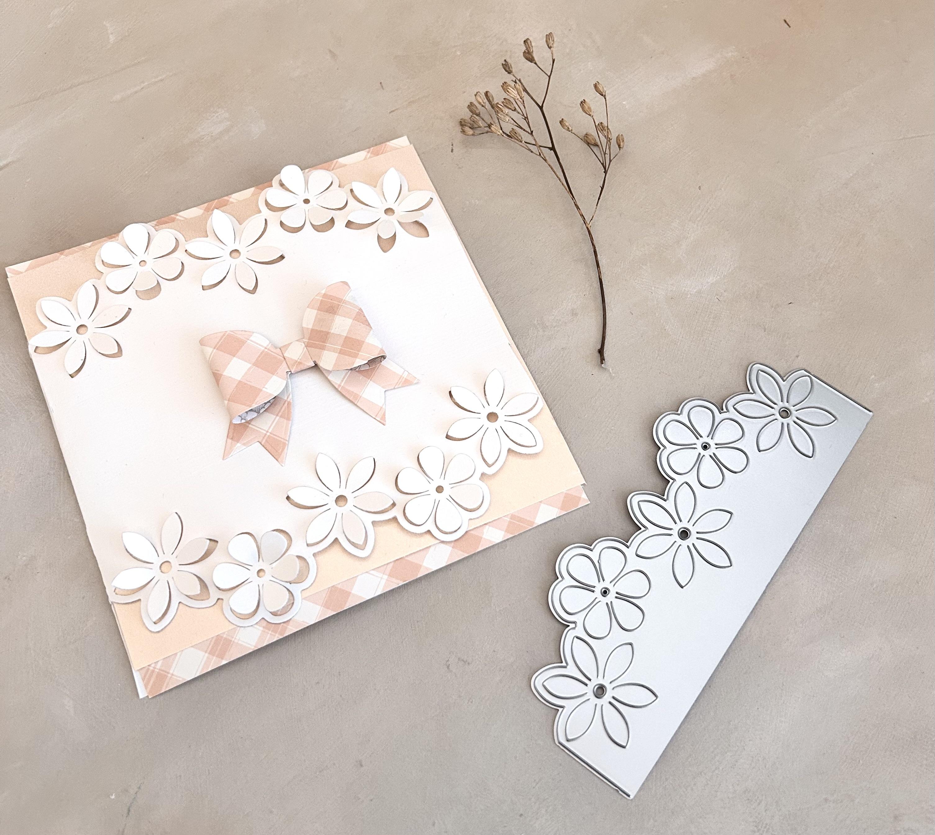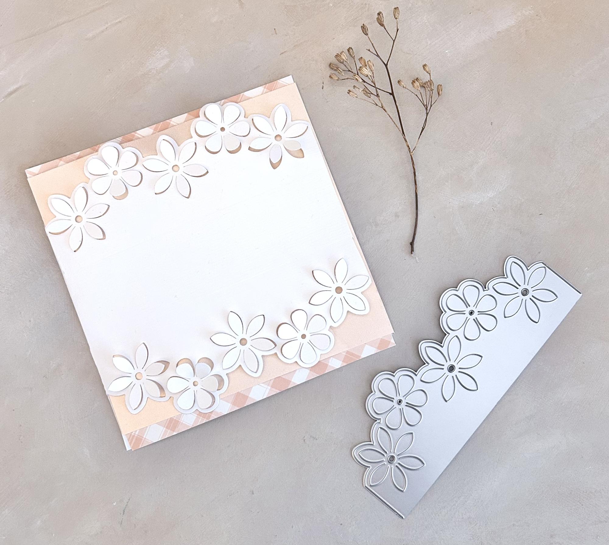 Eine niedliche Blumenbordüren Stanzschablone, die das Blumenmuster mit Pop up Blüten in die Karte bzw. in das Papier hinein stanzt. Die Schablone ist 5,5x15cm groß.