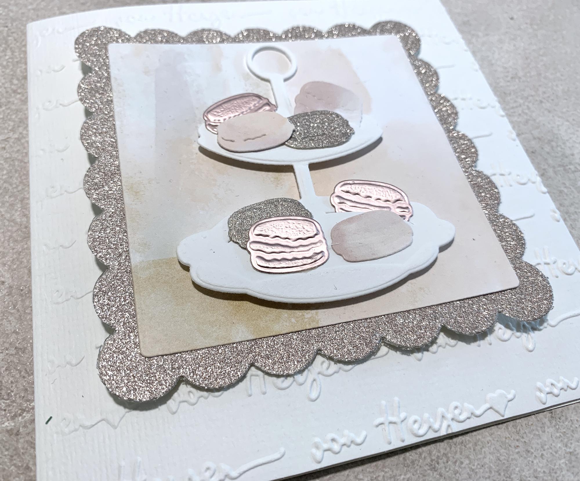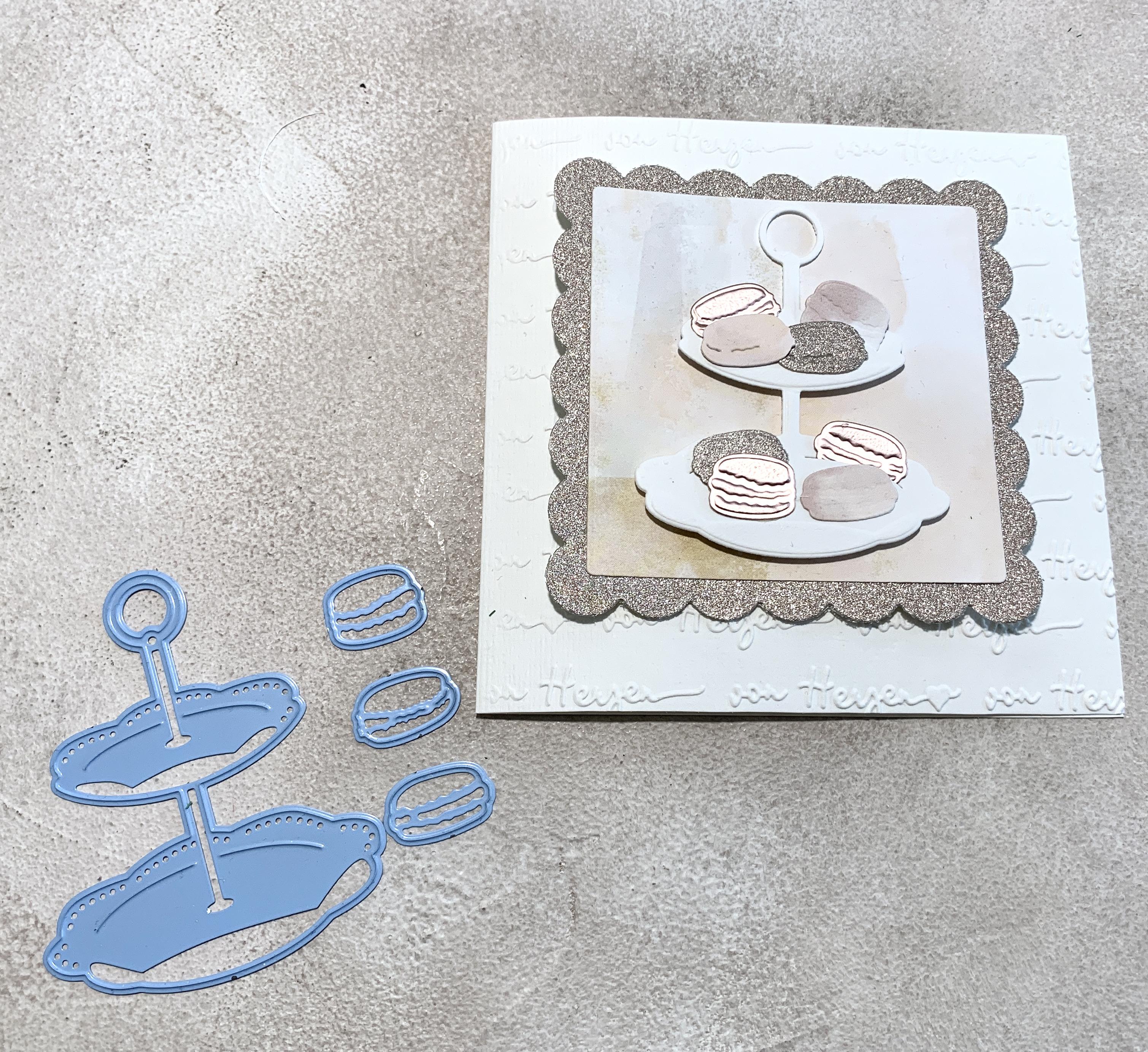 Eine wunderschöne Etageren Stanze mit macarons, für wunderschöne Einaldungskarten, einen Gruß für die beste Freundin etc. Die Etagere ist 6,5x8cm, die Macarons sind1x2cm, 1,2x2cm und 1,5x2cm groß.