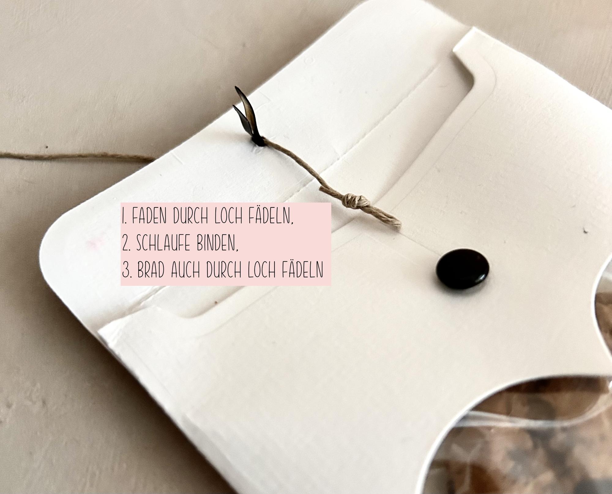 3.) Brad/ Klammer ( kann auch vorher noch durch die Papierscheibe der ausgestanzten Kreise gesteckt werden!) durch das Loch stecken und die Schlaufe von innen darüber stülpen