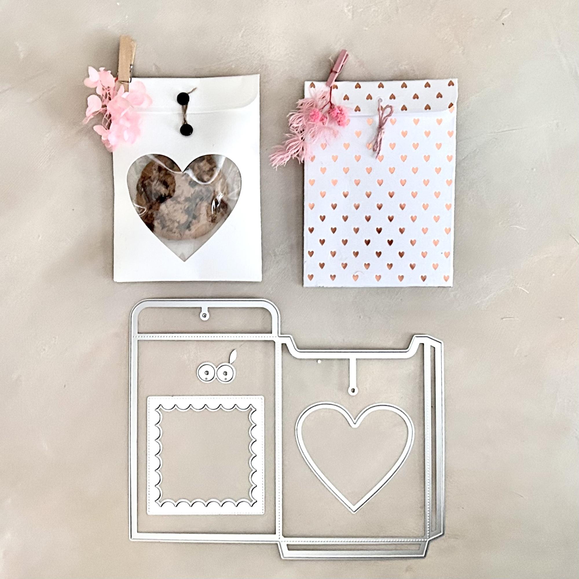 Ganz nach Geschmack kann ein Sichtfenster eingestanzt werden. Im Set ist eine Herzform und eine Scallop Quadrat Stanze enthalten. Wenn das Fenster eingestanzt werden soll, kann es direkt beim Ausstanzen des Umschlags mit ausgestanzt werden ( Empfehlung- Fixierung durch Masking Tape). Das Fenster von innen mit Acetat Folie überkleben.