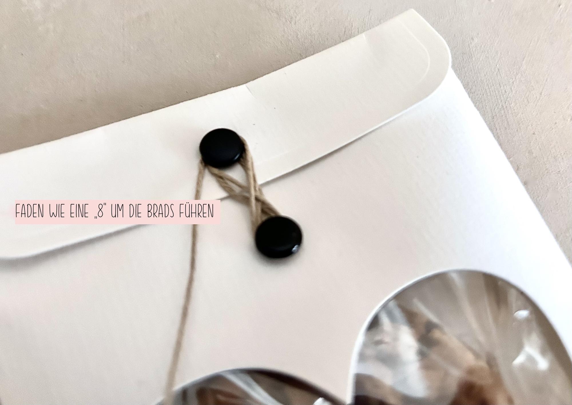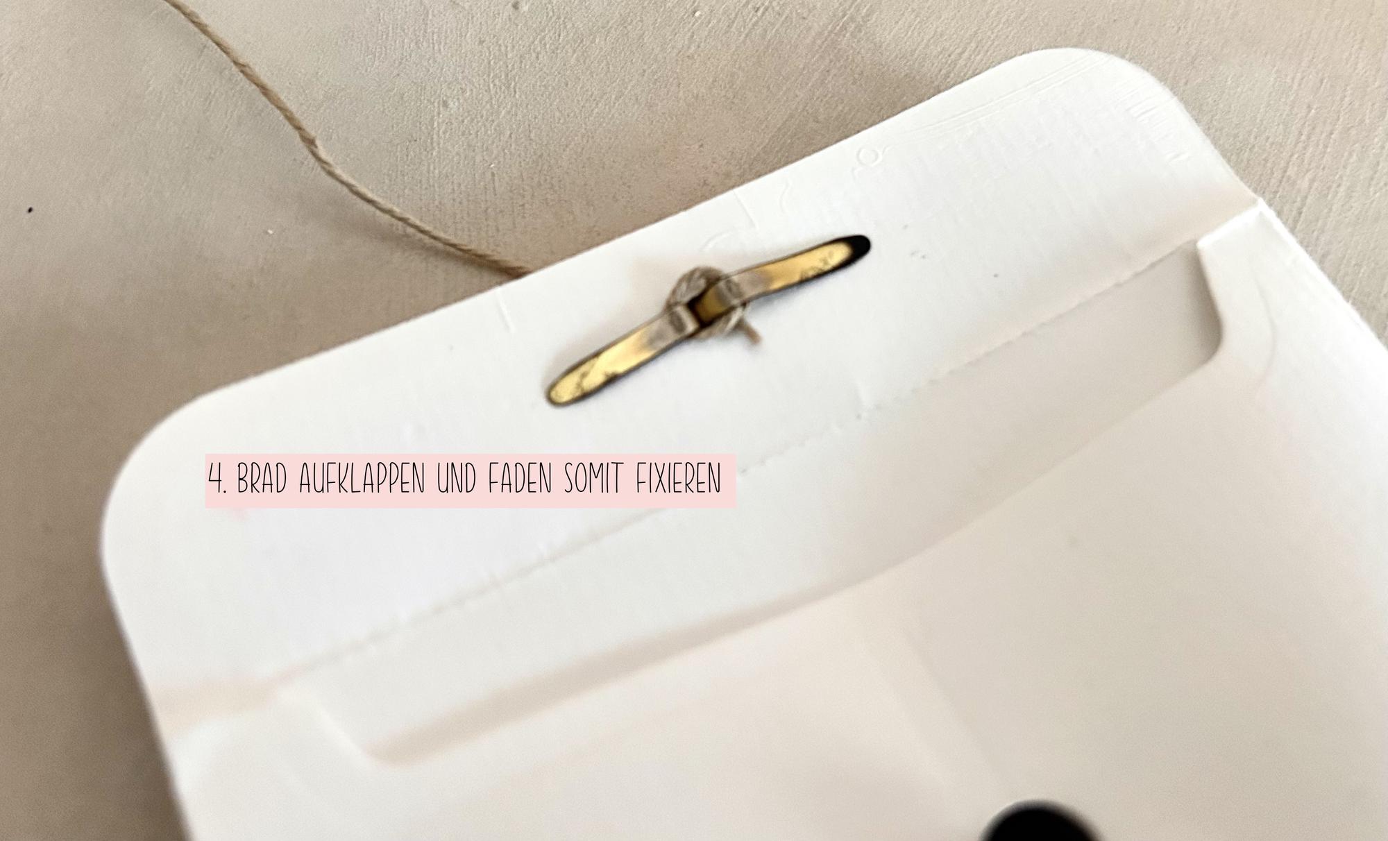 4.) Brad/ Klammer aufklappen und Faden so von innen im Umschlag fixieren
