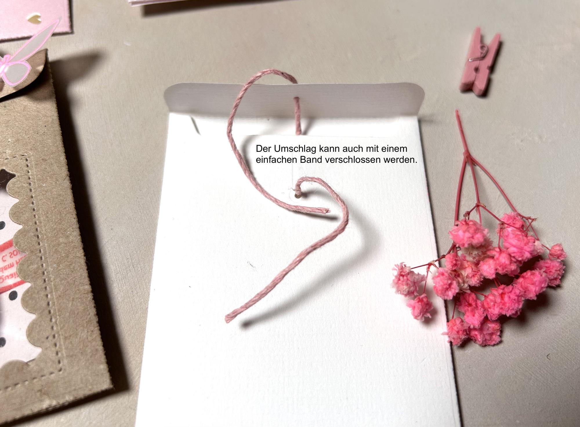 Das besondere dieser Stanze ist Ihr Verschluss, der sogenannte Japanverschluss. Er wird mit Hilfe eines Bandes, das um zwei Brads/ Klammern wie eine 8 gewickelt wird, verschlossen.