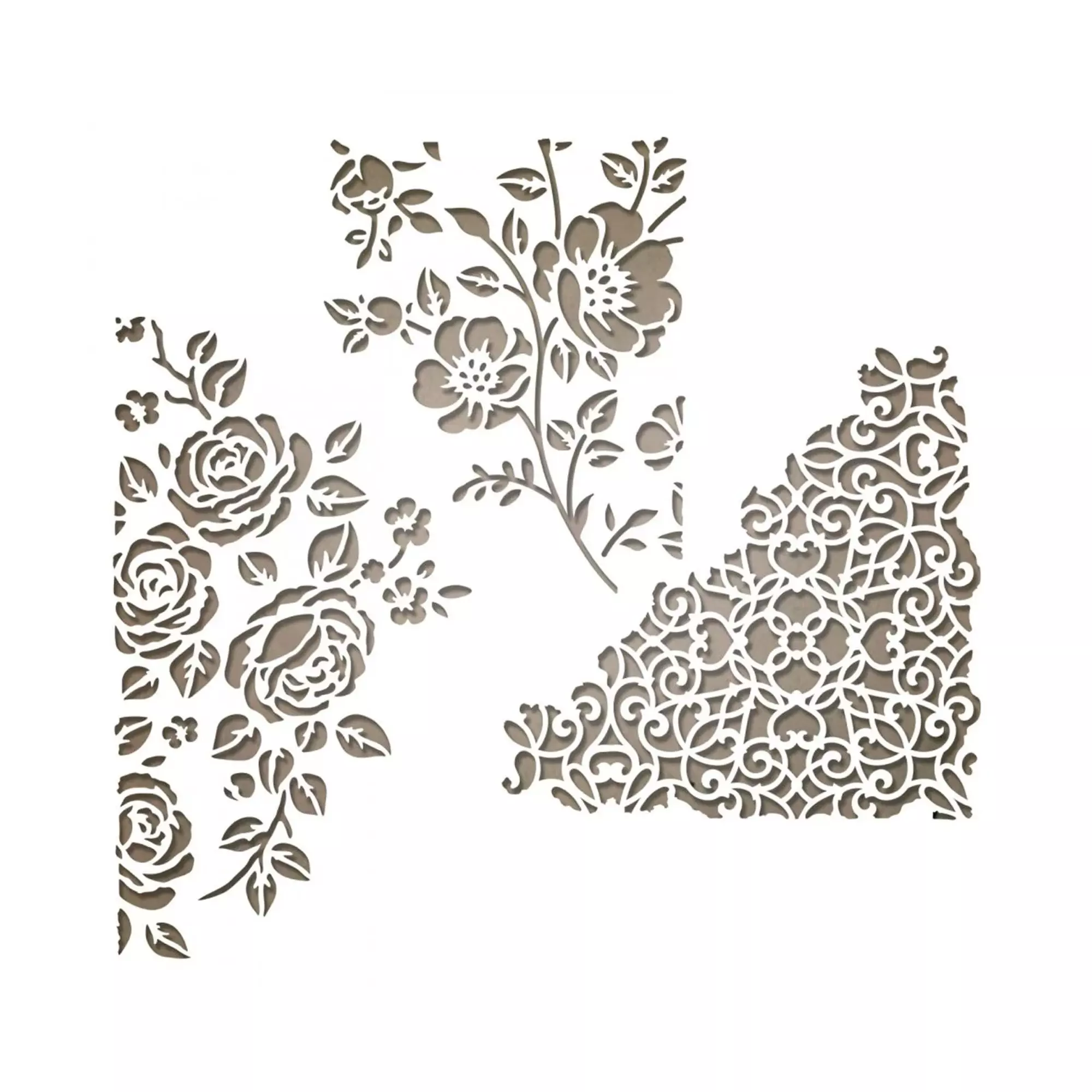 Im Set sind drei Stanzen enthalten, die diverse florale Muster in das Papier hineinstanzen.