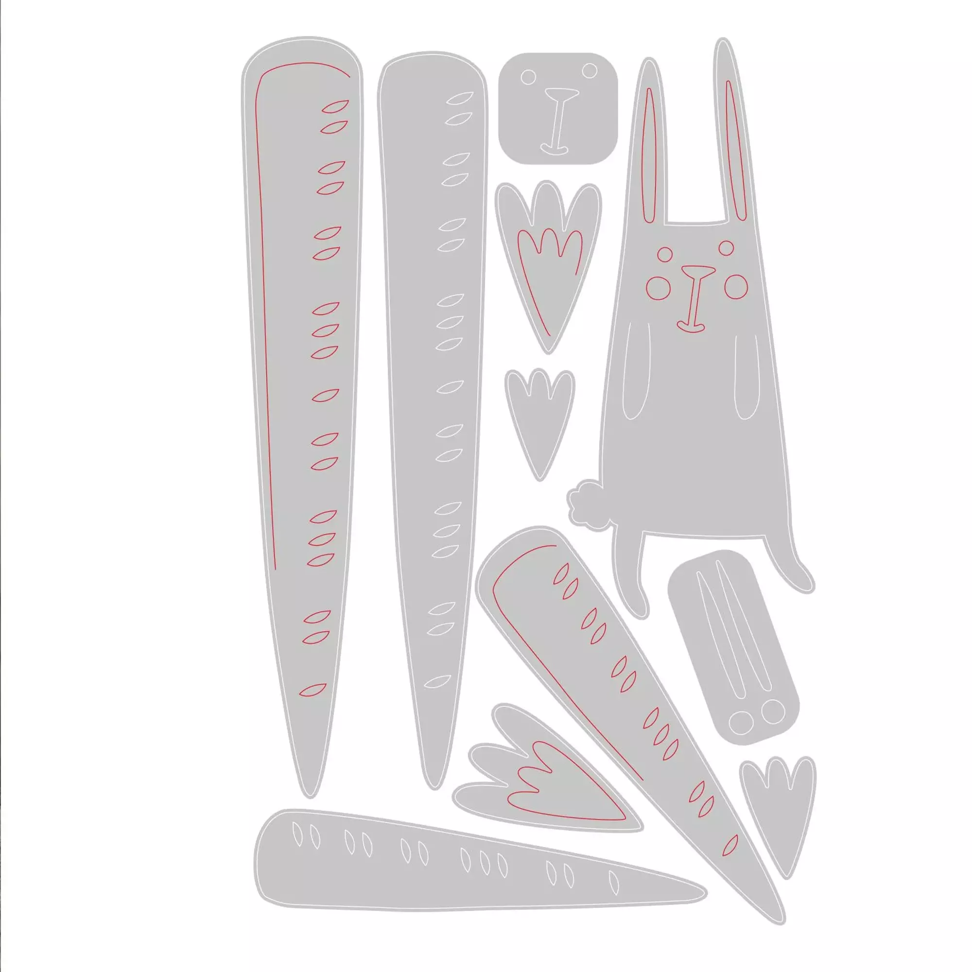 Ein 11-teiliges Ostern Hasen mit Möhren Stanzschablonen Set aus dem Sizzix mit der Handschrift von Tim Holtz. Die größte Stanzschablone des Sets ist 1,6x10,4cm.